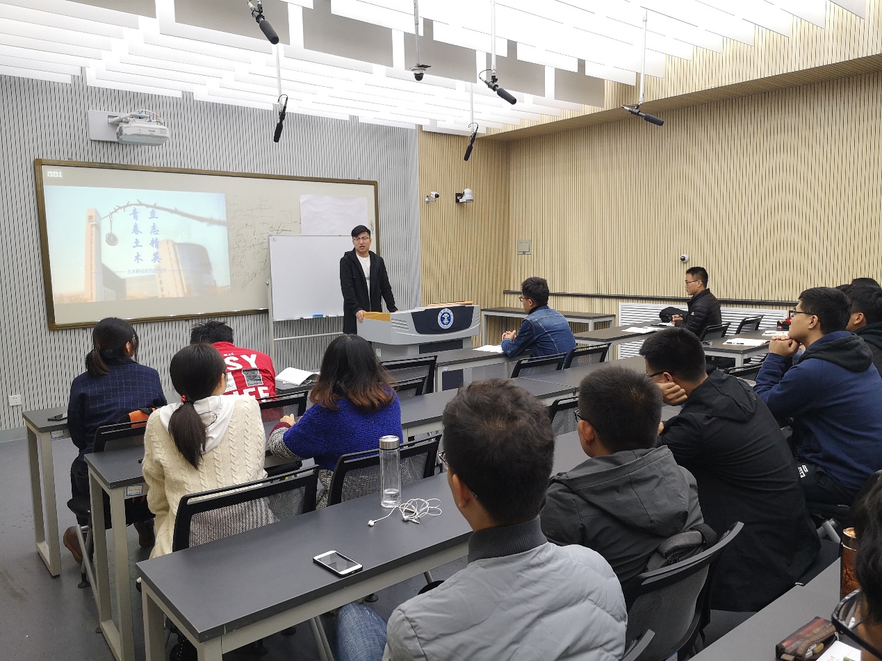 下午三点十五分,大会正式开始。大会主题为“青春土木,立志精英”。首先,研究生会主席庄昇烨对近期研会总体工作进行了汇报,主要从组织建设中的研会成员培训、研究生会日常制度和例会、土木论坛的“砼”文化系列学术讲座、职业规划讲座、文体活动建设和“关爱老人,情暖金秋”的志愿活动等方面做了总结。并希望以此确定研会的发展路线,逐步提高各部门成员的工作效率。随后,由各部门部长及做近期工作总结汇报。同时,汇报过程中各部门干事也承担相应的汇报工作,这不仅加强了对新人的锻炼,同时也是他们对自己工作职能的一种总结反思,为日后研会工作的开展和提高成员积极性有着重要意义。