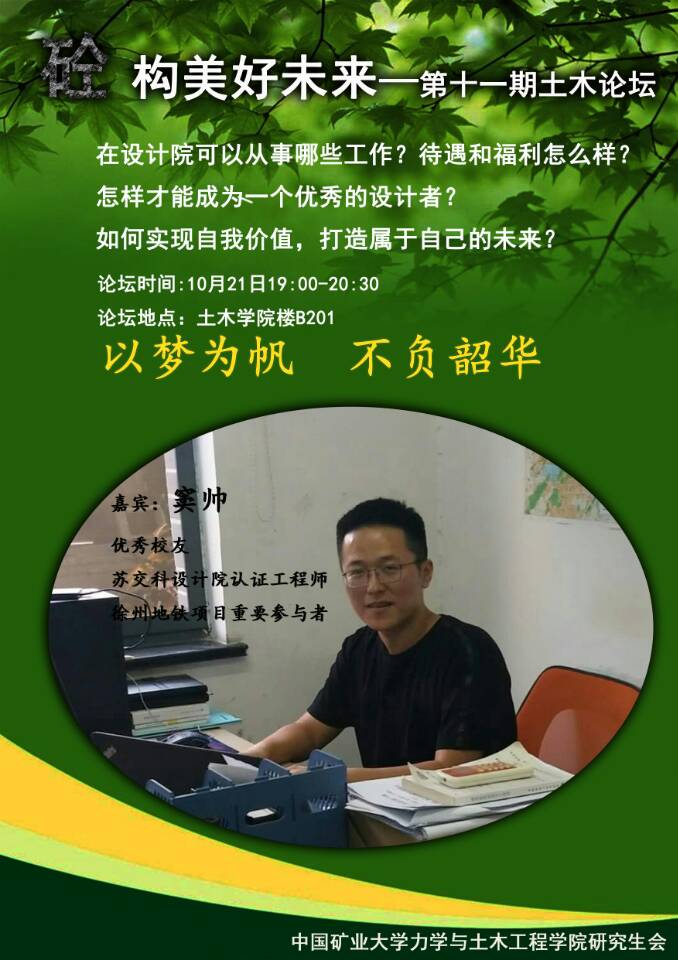 研究生会特举办“土木论坛”活动,有幸邀请了江苏省交通科学研究院股份有限公司的窦帅先生,指导广大研究生制定自己的职业规划,提高职业素养,力求在未来的求职过程中能够脱颖而出。