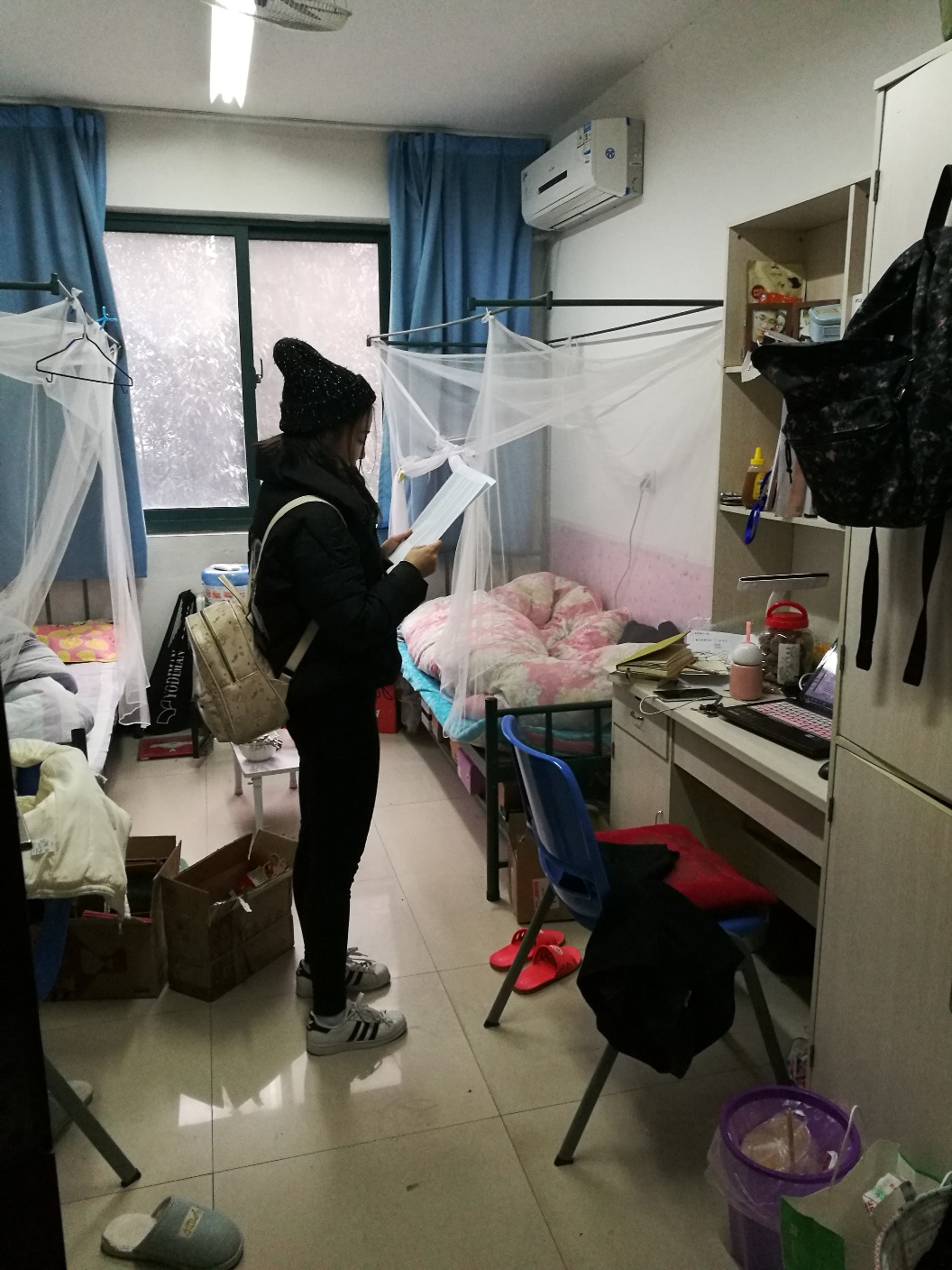 在检查过程中,检查组重点对宿舍卫生、用电安全以及防火等诸多方面进行了检查,对发现的问题现场提出并予以整改。检查中发现各宿舍卫生状况普遍良好,用电合理、安全。但与此同时,仍发现个别宿舍“不达标”,门窗紧闭,空气质量较差,电线随意拉等安全问题,检查组给予及时指正并督促其改正问题,改善宿舍卫生生活环境,并完成了复查工作。