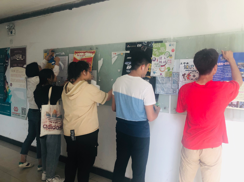 上午9时,院学生会的同学准时在桃三宿舍楼下集合,由院学生会生活部的同学分配任务,大家分成了三个小组,分头清理桃三宿舍楼内的广告栏。