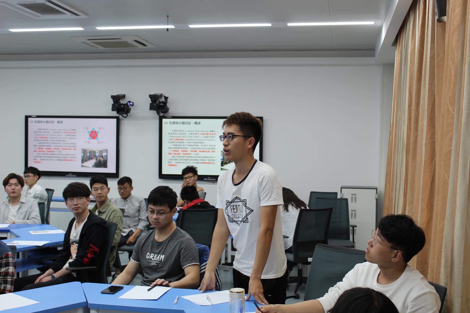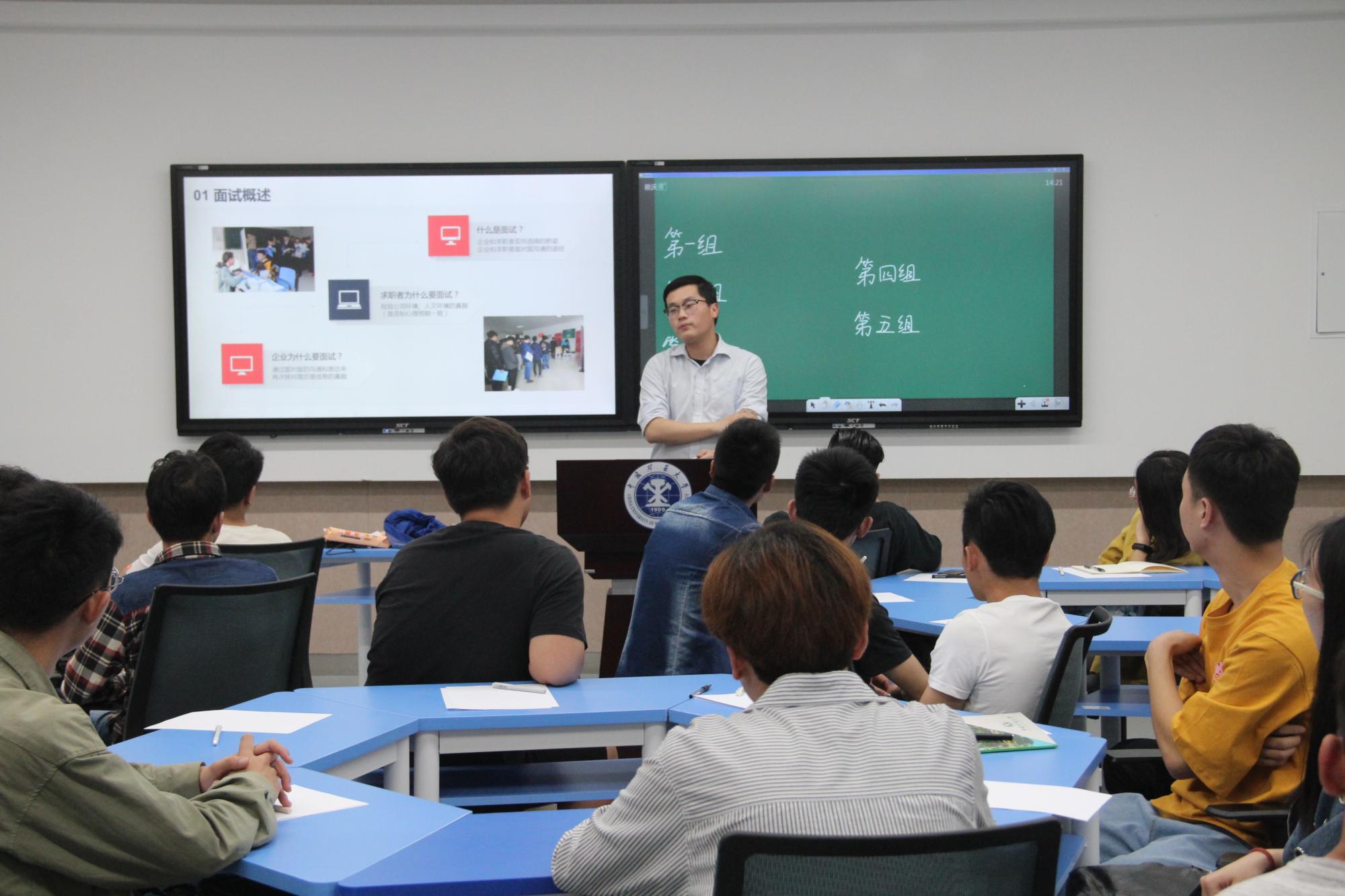 活动伊始,曹老师通过介绍面试的基本概念与流程,帮助大家更加全面地了解面试的职能与任务,他指出面试是施展个人才能和特点的好时机,一定要好好把握,不出差错。紧接着,曹老师利用常见的结构化面试内容和无领导小组讨论,并结合自己丰富的面试经历,同在场的同学进行了互动交流,以常见的15个面试问题为例,引导同学们分析,帮助同学们提高应答能力。在讲授无领导小组讨论时,现场同学成立了五个小组,并进行了三次模拟演练,演练结束后曹老师对各位同学的表现进行了点评,总结出排序型、争夺型等无领导小组讨论的解题思路,他还提醒学生在有限时间内发挥自身优势,得到面试官的欣赏,希望同学们能够真正运用到以后的求职过程中。