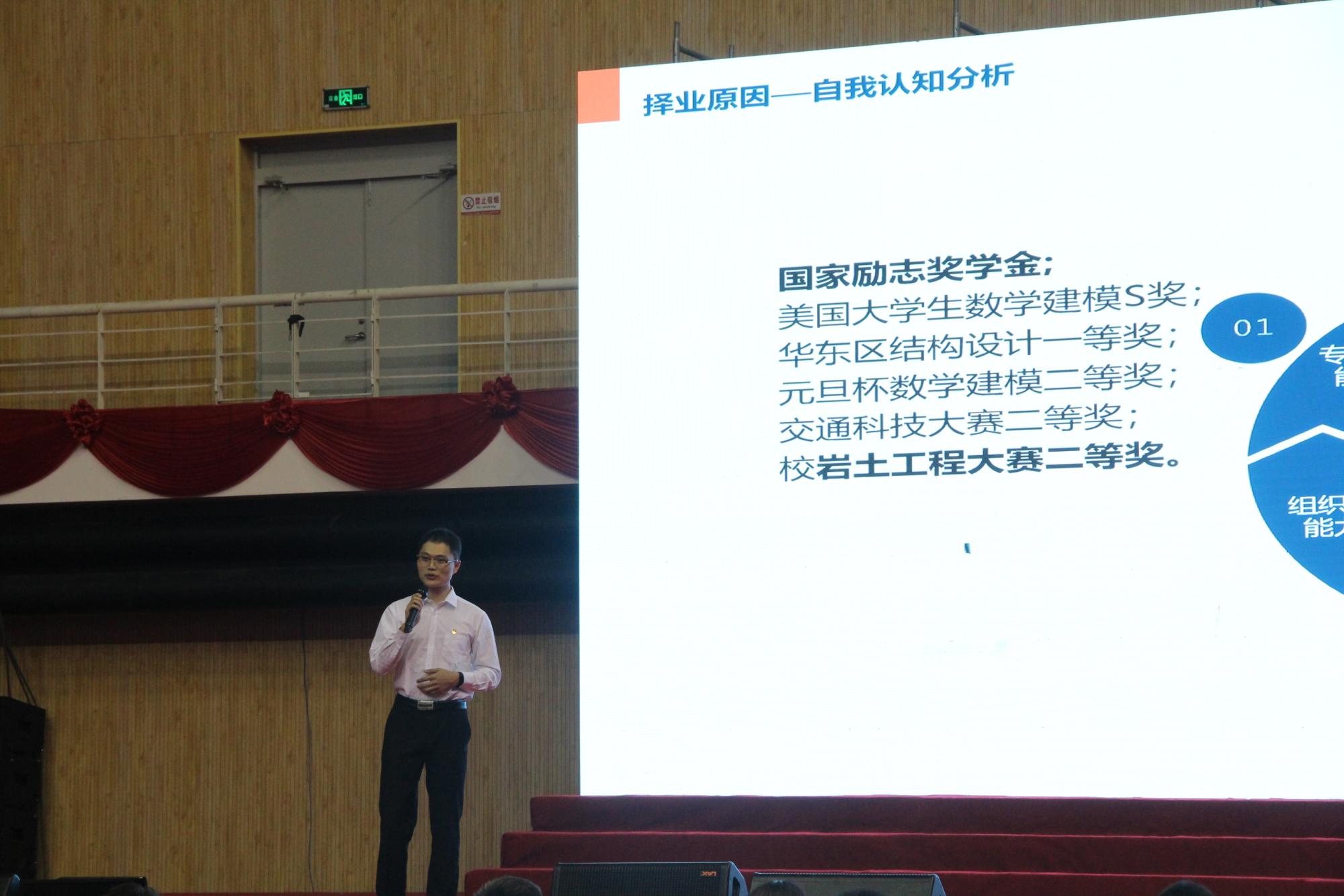 比赛现场,王密田同学讲述了自己立志成为“乔梁人”的职业规划路线,他以道路桥梁工程师为自己的职业目标,怀着“一桥飞架南北,天堑变通途”的梦想,以“读万卷书,行万里路”的精神不断鼓舞着自己,在实现自己理想的路上昂首迈进。他还把桥梁人作为自己的身份,希望为祖国的道路桥梁贡献更多的力量。王苏扬同学则以岩土工程师作为自己的职业目标,在比赛中,他以“用青春践行使命,建广厦千万间,与天下寒士共欢颜!”为主题,剖析自己的奋斗历程,讲述自己的发展路径。他说,希望能用钢筋混凝土筑起新时代伟大中国梦。