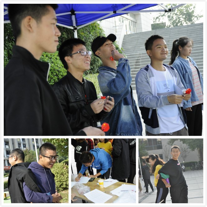 心助工作人员提前到达二食堂广场,做好准备工作。参赛人员需要在起始地点取得自己的出发卡,然后迅速赶往五个任务点,在完成指定任务,获取通关资格后回到起点,时间最短的队伍获得胜利。在对玩家进行党知识的提问考查后,选手们两人一组,背夹气球行进到指定位置后夹破即为通关,现场气氛十分热闹。本次活动特别设置了“中华人民共和国成立七十周年答题环节”,各站点对选手们提出的与国家政策、改革开放相关的问题,与本次活动的主题相呼应,也让同学们对新中国成立以来的飞速发展有了更多的了解。