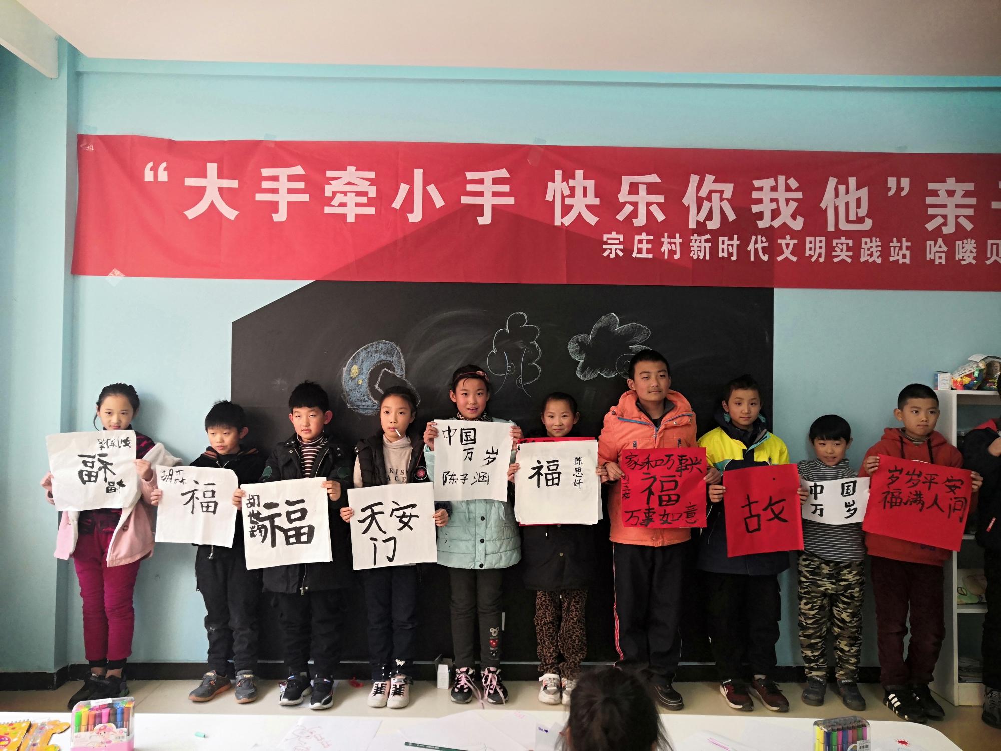 在大李庄村委会,乒乓球协会的志愿者们耐心教授了乒乓球攻球技巧,带领孩子们感受乒乓球的乐趣。前往宗庄村综合服务中心的志愿者们为小朋友们辅导功课、检查作业,在一次次互动中,志愿者与孩子们的关系越来越亲密。彭奕昕同学以PPT授课的方式,为孩子们讲述了书法的相关知识,随后带领孩子们分别进行了软笔书画和绘画的练习。在志愿者的协助下,孩子们很快掌握了毛笔的握笔与书写技巧,尽情创作展示创意。