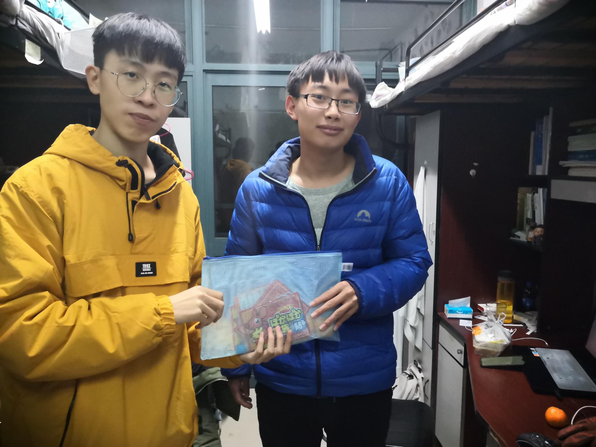 晚上七点,活动的负责人们来到桃三楼B201准备此次送祝福活动的礼物。他们为240名考研学子精心挑选了礼物,其中包括小刀、胶水、热敷眼罩、暖宝宝贴以及寓意着“心想事成”的橙子。每个人的礼物袋中都有着黄色直播