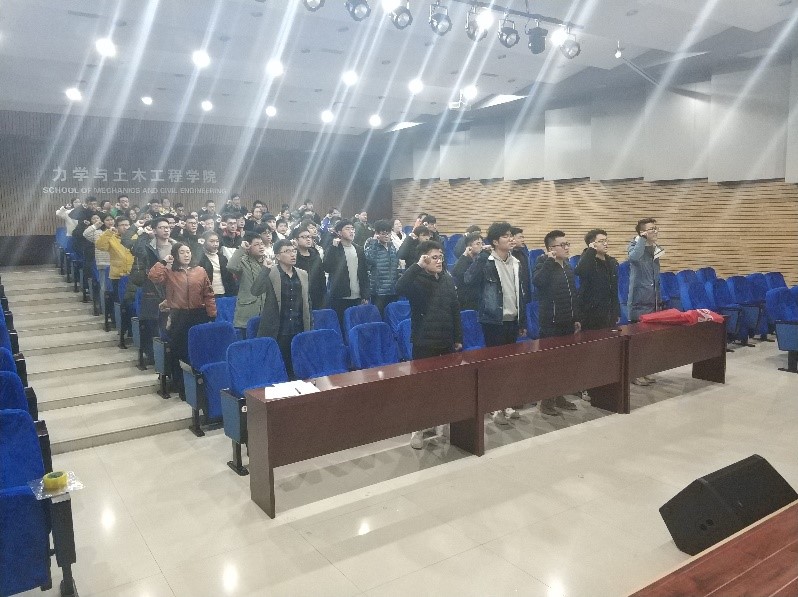 活动伊始,研究生党支部潘小凯同学宣布活动开始并介绍本次活动的主题。接着,他带领同学们进入了第二环节:笔爱国情——签名活动。同学们依次在“勿忘国耻,振兴中华”的横幅上签下自己的名字。签名完毕后,同学们将签名横幅挂于讲台中央,全体起立宣读誓词,并组织同学们集体观看影片《南京(被遗忘的1937)》。