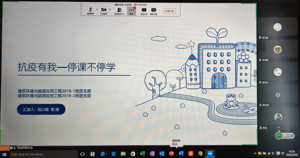 当前,新型冠状病毒感染肺炎疫情的防控工作正处于关键时期,全国上下众志成城。在团委“停课不停学”的号召下,建环18级1班和2班团支部于2月29日共同开展“抗疫有我,停课不停学”线上主题团日活动。