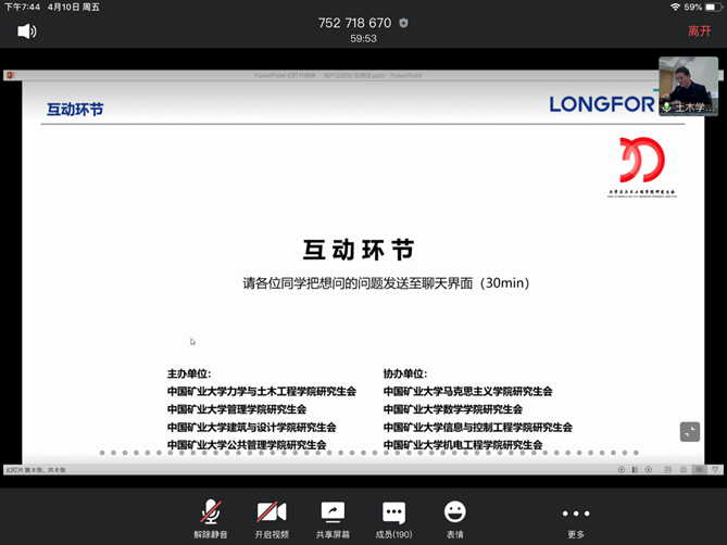 4月10日晚19时,如期举办了“地产云论坛-投资岗”视频讲座,活动通过腾讯会议APP进行线上直播。龙湖徐州地区投资总王元伟先生应邀参加,针对学生较为关心的地产行业问题做了详细的剖析,来自全校各专业的190余名学生参与了此次视频讲座。