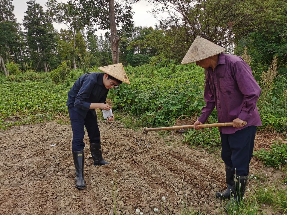 上午8时,实践活动于宜兴市丁蜀镇周墅社区正式展开。高曜翔同学按照耕种流程,换好长衣长裤,戴好斗笠,带着锄头、钉耙、镰刀等耕种工具进入农田,切身体会耕作过程之艰辛。在社区村民的带领下,根据村中农民的讲解和具体演示,实践成员便开始亲自体验。由于村民们在前一天已经做好了播种前的准备工作,实践成员直接开始撒籽耕种作业。据悉,在撒籽工程中每一排要分5~6个撒籽点,每个点撒4~5颗籽,并在撒完籽后用土将籽填好。待全部填好后,实践成员还要用镰刀割田地旁边的草,将它们铺在刚刚耕种的土地上,以防止阳光暴晒。再用扁担挑着水桶来从湖边打水,用水壶、水瓢给田地浇水之后,耕种作业也全部结束。此次耕种作业持续了两个小时。