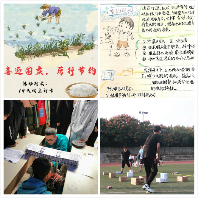 为提高同学们的积极性,各学生组织以此为主题策划系列活动。在“趣味环保嘉年华”活动中,大学生传媒中心的同学们利用回收的废弃易拉罐、旧纸箱等策划了一场趣味运动会,在培养环保意识的同时也让同学们体会到了运动的乐趣。大学生心理自助中心开展了主题手账征集活动,用漫画、剪影、小贴士等形式呼吁同学们勤俭节约从你我做起。5·12青年志愿者协会组织的“厉行节约”打卡活动旨在督促同学们通过连续18天的连续打卡晒照养成勤俭节约的好习惯,同时在朋友圈中传递积极正能量,带动节约之风。此外“卡牌大师”、主题征文活动等也获得了同学们的一致认可。