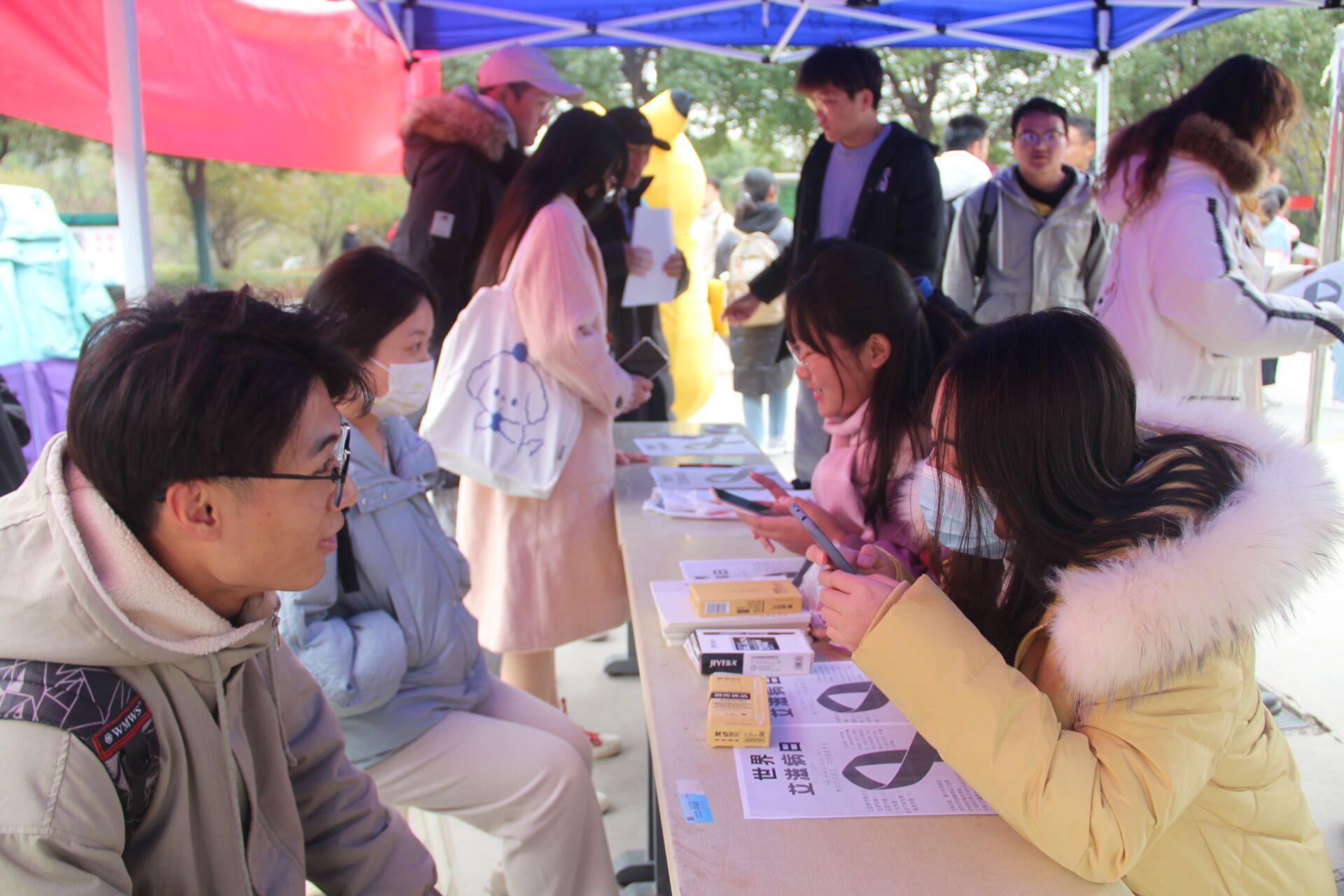 12时许,活动准时开始,工作人员向来食堂就餐或者路过的同学发放宣传海报,对艾滋病的传播途径、致病机理等方面进行知识普及,并邀请同学们参加现场的有奖问答活动。此外,为感召同学们对艾滋病患者的理解,工作人员在现场设置了贴有“如果我有艾滋病,你愿意抱抱我吗?”字样的皮卡丘人形玩偶与同学们进行现场互动,收集同学们奉献爱心承诺的现场签名,得到了同学们积极地响应,在黄色直播