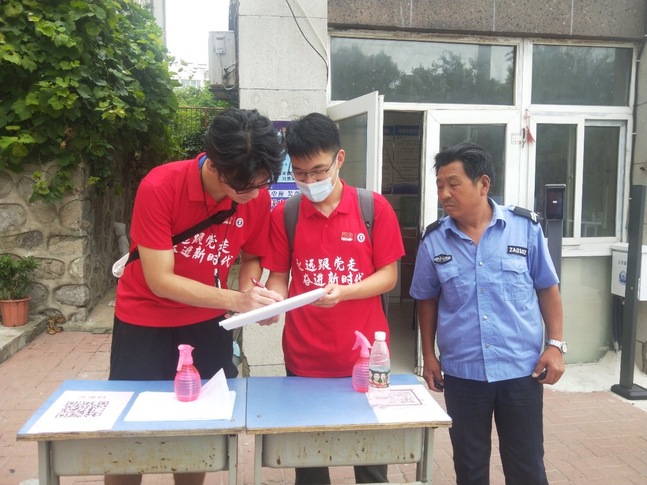 为配合社区疫情防控工作,部分实践团成员来到保安亭,配合社区保安对过往居民进行体温测试、排查疫苗接种情况、日常消毒登记等工作。部分成员前往垃圾站协助环卫工人进行垃圾分类并向社区居民普及垃圾分类相关知识。之后在社区工作人员的陪同下一行人进行社区巡查,帮助他们摆放居民电动车,清理消防通道的违规堆放物,拾捡小区绿化带内随意丢弃的垃圾。