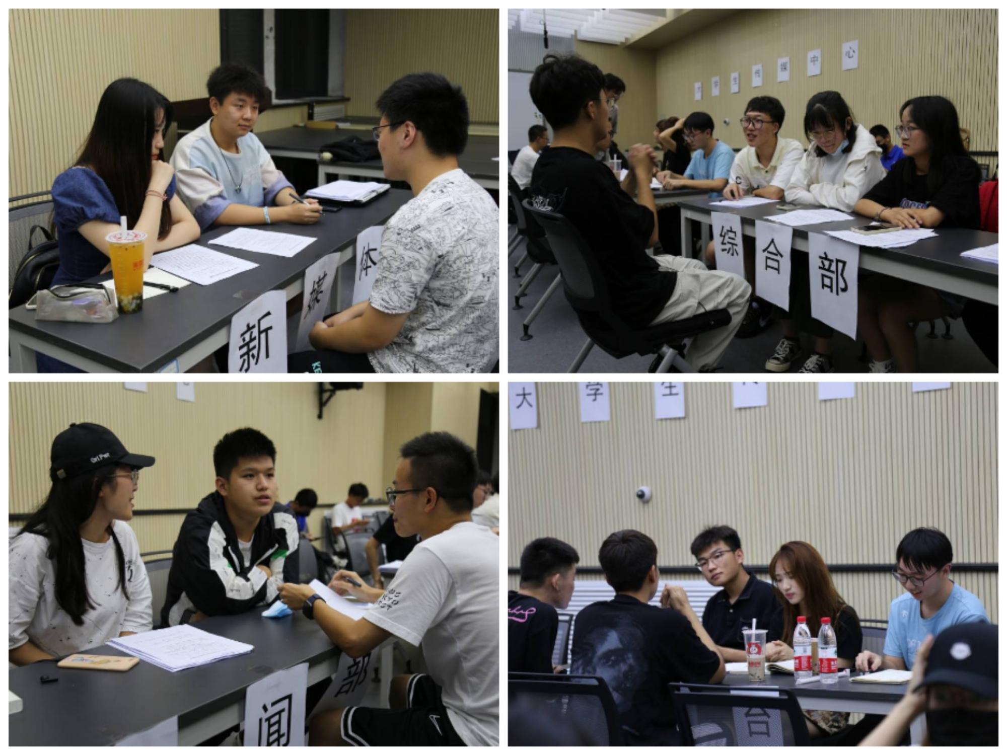 楼,他们在进行简单的准备之后,前往面试地点进行面试。面试过程中,各个部门招新人员仔细浏览同学们的报名表,并就同学们的兴趣爱好,各部门需要的专业技能等方面进行简单的提问并耐心为同学们答疑解惑,同学们的精彩表现也受到了各位学长学姐的好评。