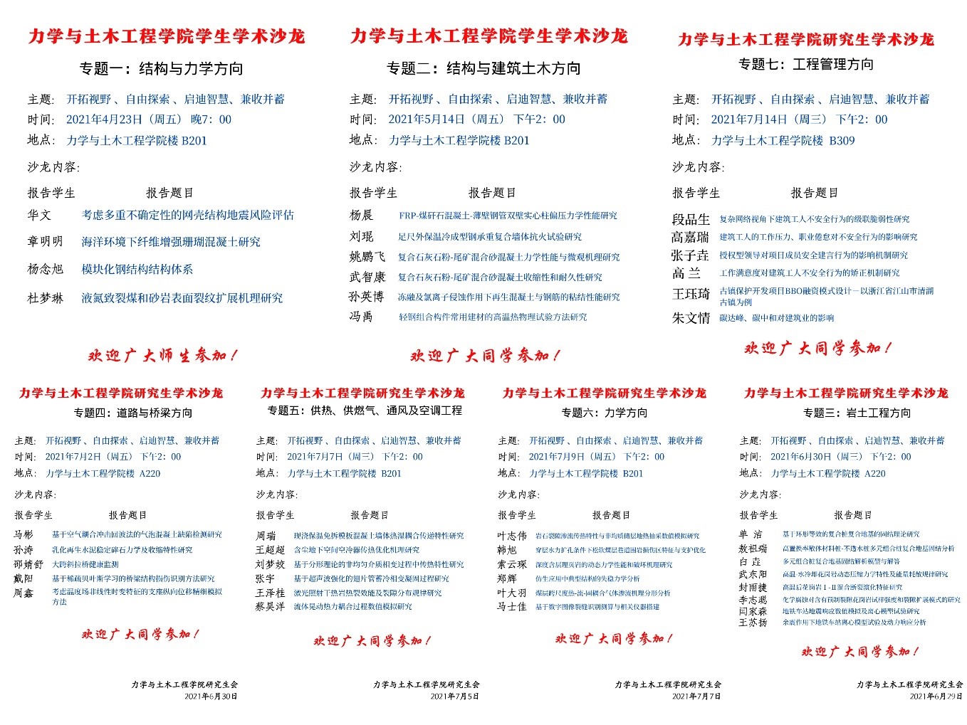 研究生群体为活动对象,在2021年4月至7月积极开展了“聚焦力学土木,交流学科前沿”学术论坛系列讲座。