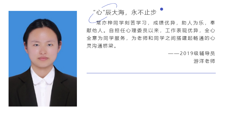 常亦桦一直秉持着“自助,互助,助人”的理念,在完成自己心理委员工作的同时,她也致力于把更好的观点、更专业的知识传播给更多的心理委员,一起帮助更多的同学,她的事迹与品行值得每一个心理委员去学习。