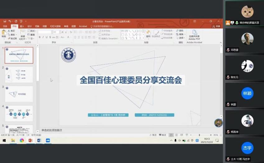 全体心委介绍了入围全国百佳心理委员的流程、材料准备过程及心路历程,也向大家分享了心委工作的宝贵经验,介绍了评选校级、院级优秀心理委员的流程。