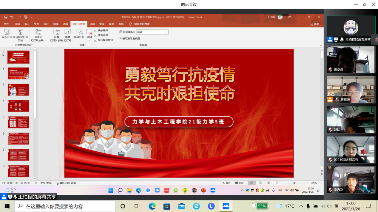 力学21-03班开展了线上疫情防控主题班会。本次班会由力学21-03班的班主任段育洁老师主持,班级全体同学参加。