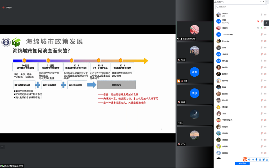 秦颖荣总工的报告主题为“海绵城市概念及技术要点介绍”,她通过科普与传统园林文化相结合的方式,从海绵城市的概念与背景出发,详细介绍了海绵城市的发展历程,并结合昆山海绵城市建设项目的案例,深入浅出地为学生讲述了海绵城市设计分区、设施选型、标高核对、植被设计、设施维护等设计要点,分析了海绵城市与绿色建筑的协同发展关系。在答疑环节,秦颖荣总工耐心解答了同学们提出的问题,并期望同学们今后能够在海绵城市的研究上有所建树。会议最后,乔亚宁副教授作总结发言,希望同学们能从此次讲座中找寻到自己的人生标识,顺风扬帆,勇往直前。