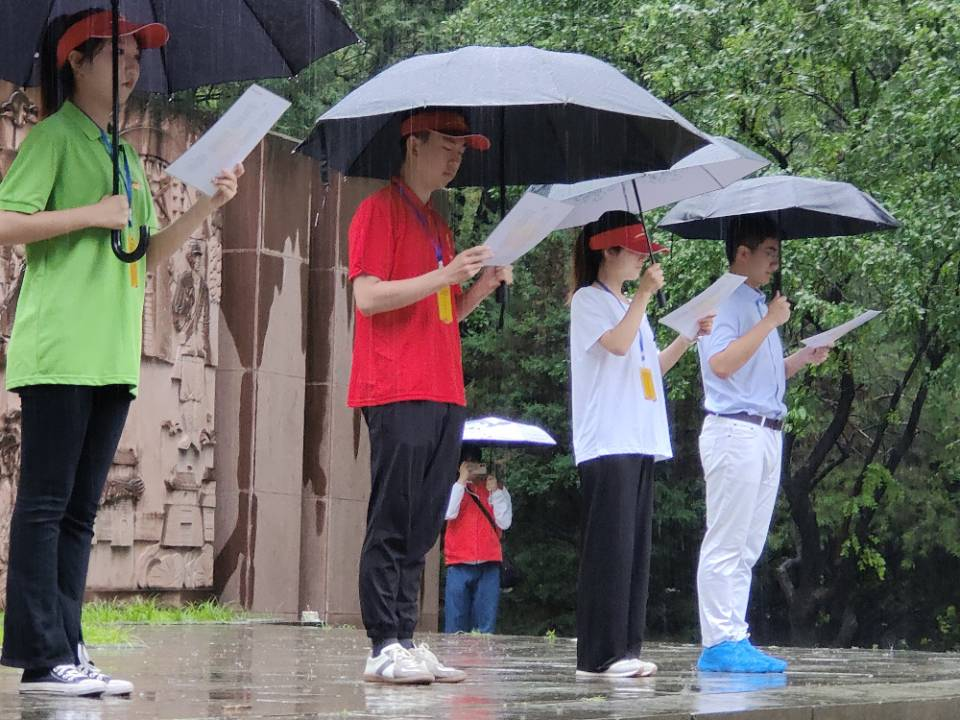 7月22日上午,实践团赴张思德广场开展“重温经典,感悟初心”实践教育活动,学习张思德同志的英雄事迹。天空虽然下着大雨,但实践团成员的步伐却异常坚定,实践热情丝毫不减。在实践团成员张泽杨同学的带领下,实践团成员深情诵读毛泽东同志为张思德所写的文章《为人民服务》,学习感悟以张思德同志为代表的中国共产党人全心全意为人民服务的初心。