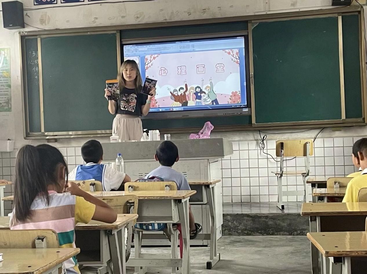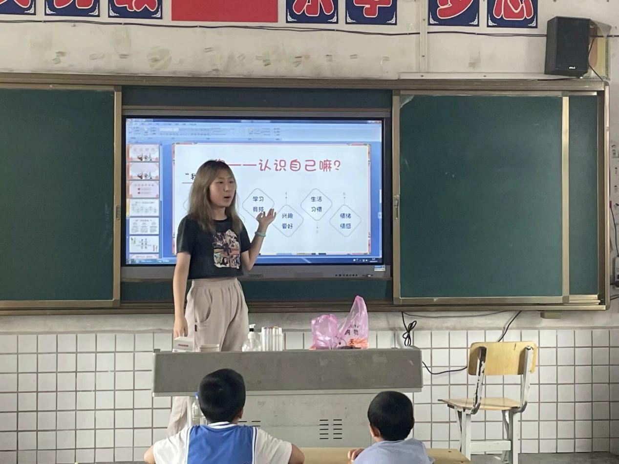清晨的第一节课,是张倚宁同学的心理辅导课。由于之前在为期3天的家访活动和日常的教学过程中,支教团成员们发现部分孩子有一定的孤独感和厌学情绪等心理问题,就决定通过让孩子们在画纸上画出对自身形象的认识,而后委托团队中的心理老师对孩子们的画作进行分析。分析过后,针对每个孩子的画作采用“点对点”的形式逐一了解每个学生的心理健康情况,并以此为根据为每个孩子制定相关的心理辅导计划。在与孩子们进行深入的交流过后,心理老师团队发现有许多孩子画出的自身心理状态是孤独的,而后团队经过调研分析得出产生这些问题的主要原因是这些孩子大多是留守儿童,缺乏父母的关爱,并且受到当地教师关注较少。对于此问题,支教团心理老师对孩子们进行了心理疏导与鼓励,对偏远地区的留守儿童的心理健康状况进行了统计记录,并为以后课程的开展作出了准备。在课程最后,张倚宁同学给孩子们留下了画出心中的“房树人”画作的课后作业,后续会有团队心理老师跟进,并对孩子们的画作进行分析,继续开展“一对一”心灵交流与心理问题辅导。