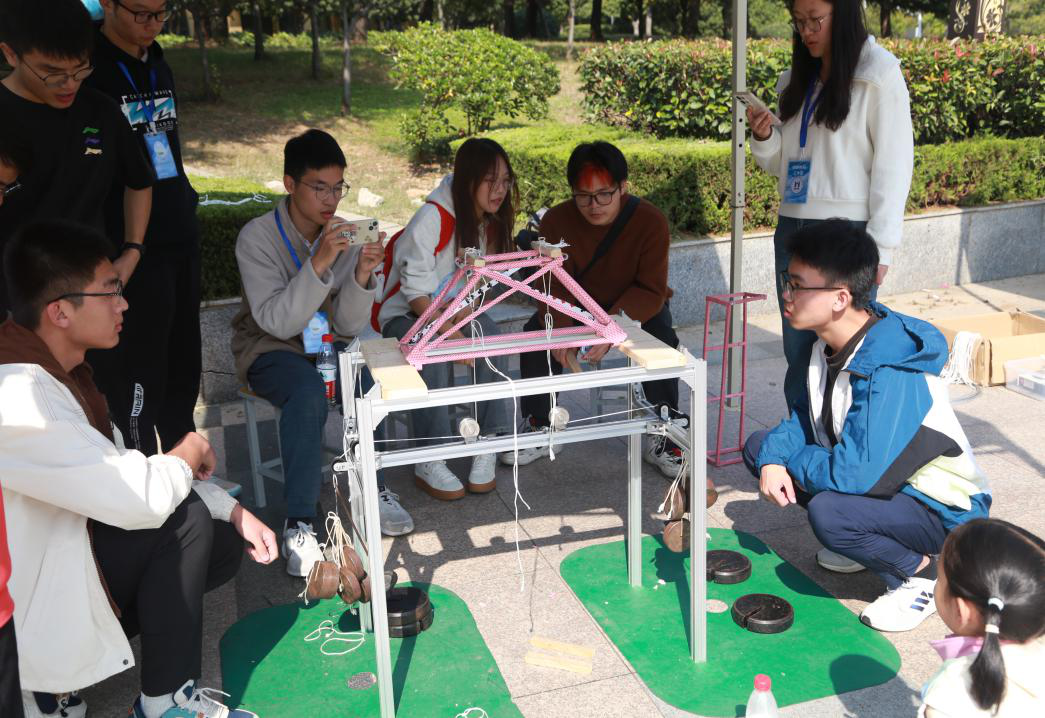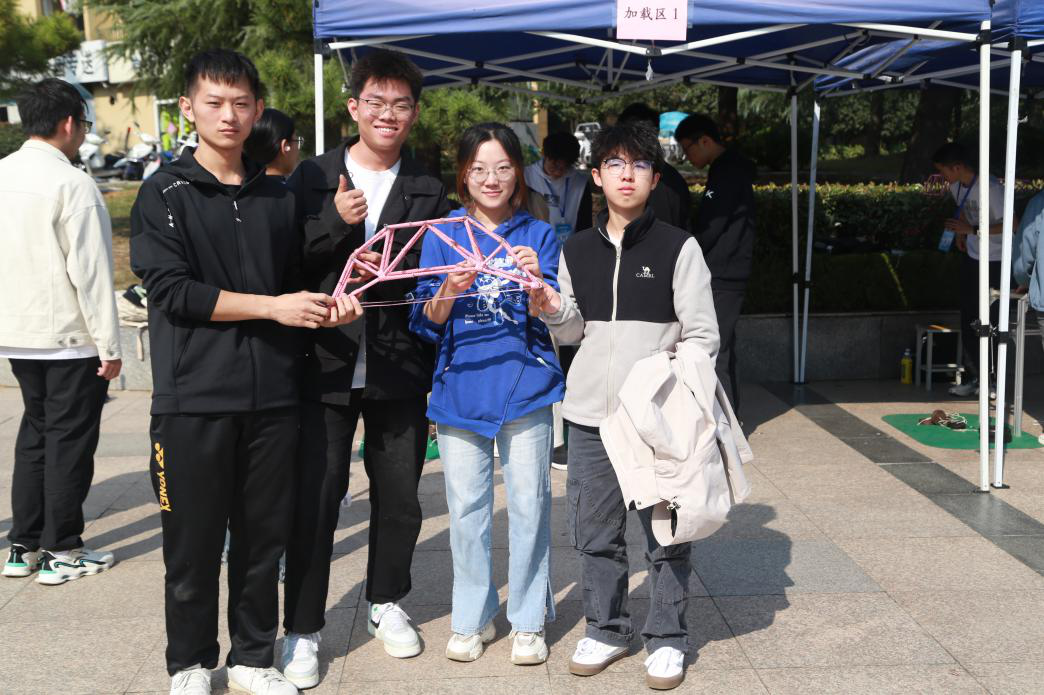 参赛选手需要在比赛开始前自由组队,并在规定时间内领取所需材料并制作参赛模型。比赛在上午8点正式开始。赶到赛场的各组选手在工作人员的指导下首先对参赛模型进行称重,随后进行加载。这个过程要求各组人员逐级加载共六级的砝码。现场,参赛选手们紧张但有序地进行加载,观众也认真关注比赛进展,不时低声讨论各模型的美观和稳定性。每当有一组队伍的模型成功通过六级加载,现场便爆发出阵阵掌声。队伍成员激动地与他们建造的模型合影,而那些未能如愿的队伍则决定明年再来挑战。最终,比赛于当日下午5点结束。