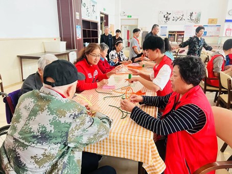 下午三点半,志愿者们到达九如城康养中心云龙院,与老人们在一起聊天谈心。简单地慰问之后,志愿者们与老人们开始制作扭扭棒,大家相互配合,共同完成。在制作过程中,志愿者们与老人们一边合作,一边交谈,既能让老人们参与其中,亲身体验到做手工的乐趣,又能让老人们感受到温暖与关怀。现场气氛热闹欢快,老人们认真投入到制作手工的活动当中,在志愿者们的协助下,老人们最后制作完成了属于自己的独一无二的扭扭棒,一些无法独立完成的老人也都收到了志愿者们赠送的手工作品,每个人的脸上都洋溢着自豪、幸福的神情。活动最后,老人们一同举起手中的扭扭棒,在空中尽情的飞舞。