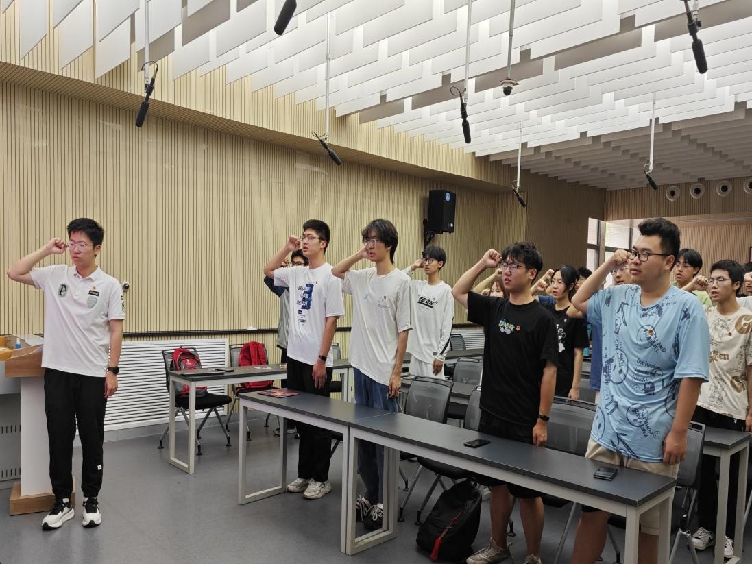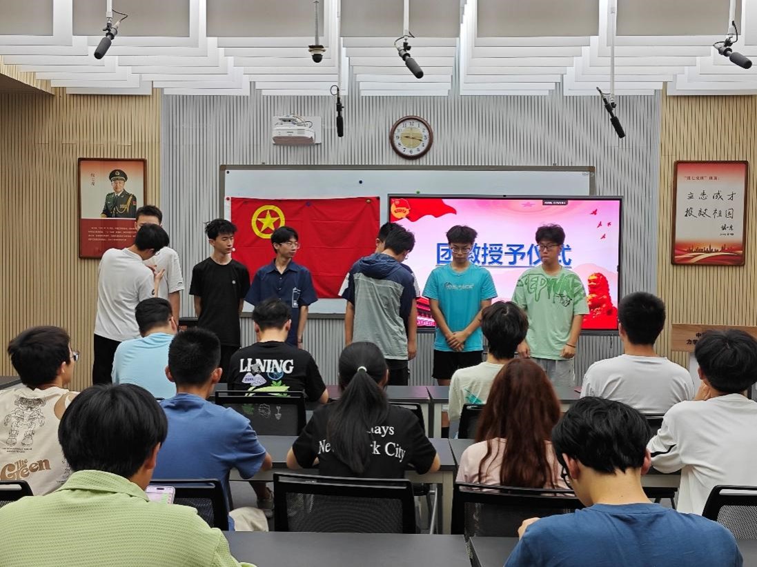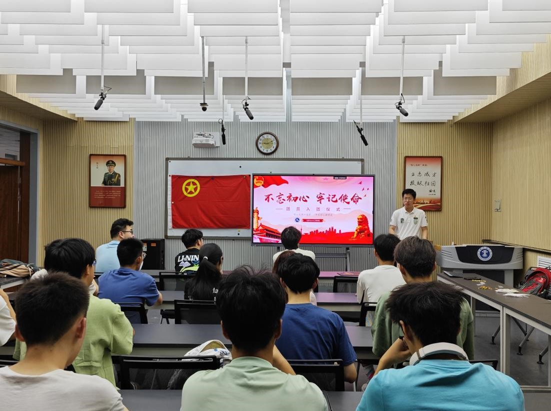 仪式伊始,全场肃立,随着国歌的奏响,同学们共同唱响了中华人民共和国国歌和共青团团歌,展现了青年学子的爱国热情和团结精神。王宇祺宣读了2023-2024学年新团员名单。在庄严的气氛中,优秀团员代表逐一为新团员佩戴了团徽,象征着他们正式成为共青团的一员。