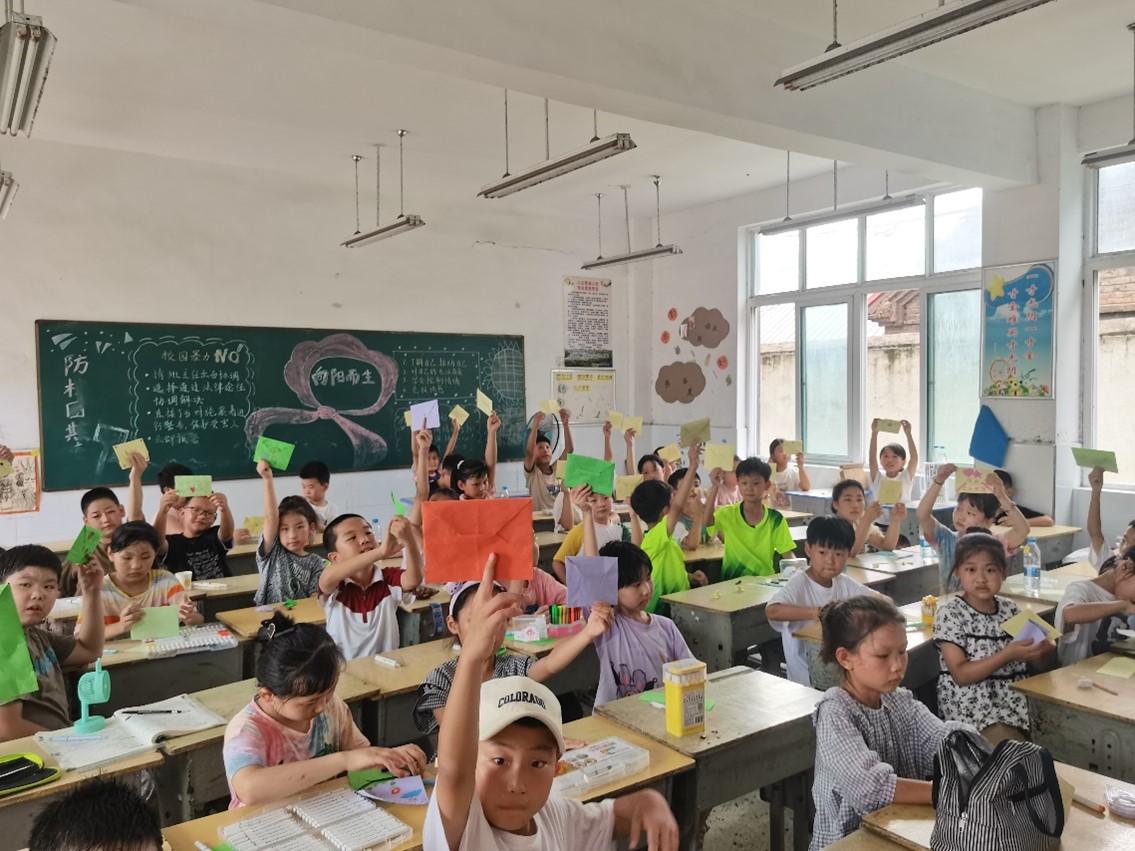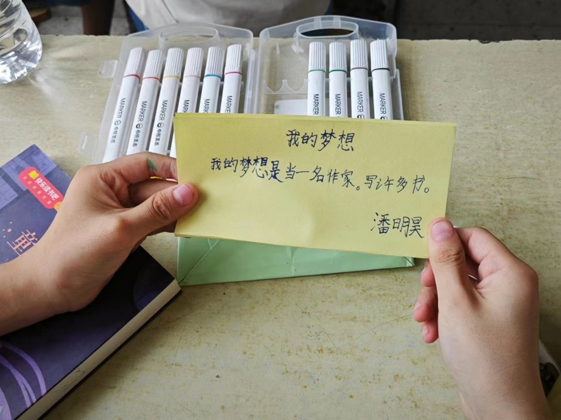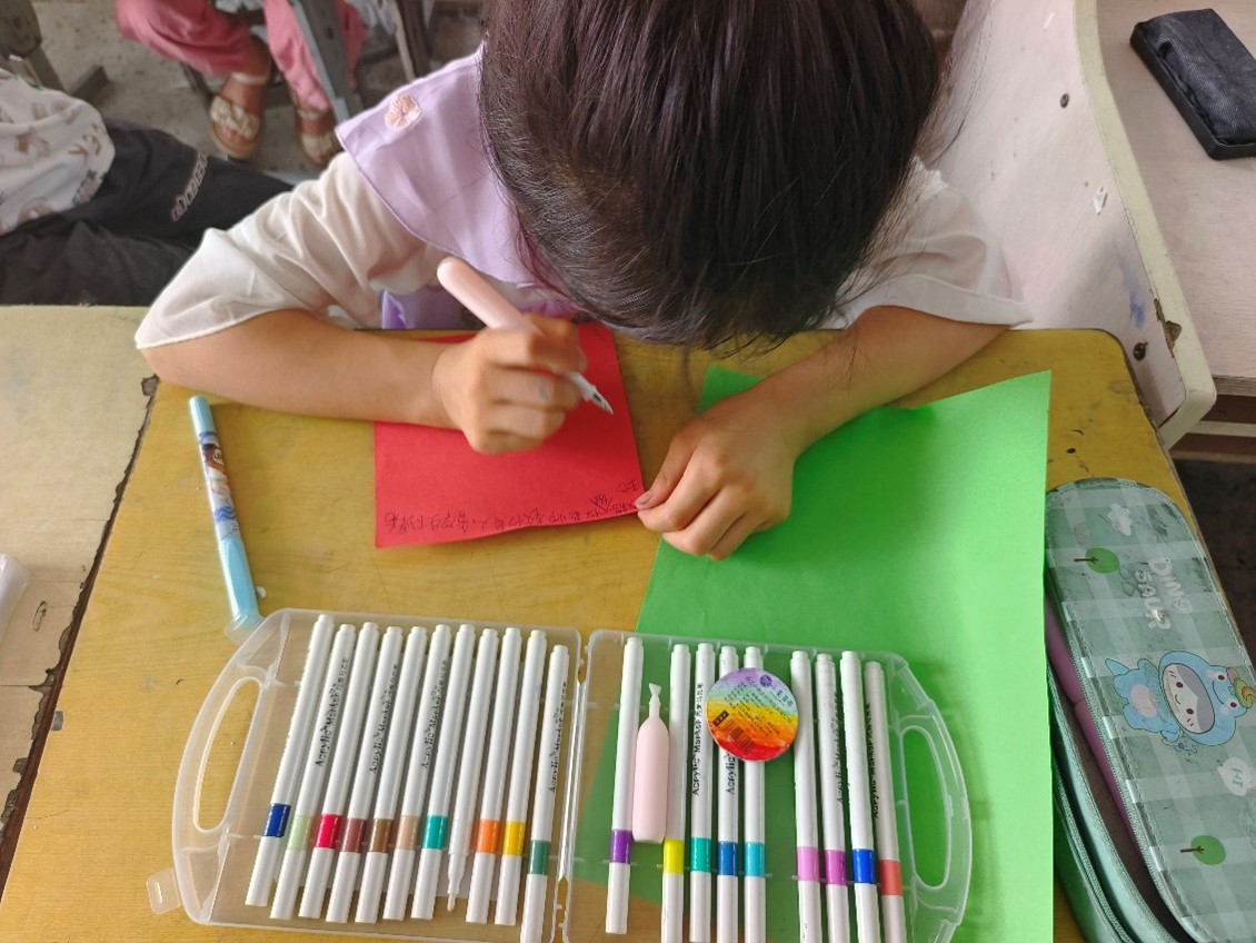 此次活动旨在通过互动和启发,激发学生们内心深处的梦想火花。在活动现场,支教团成员们为每位孩子准备了两张特别的“梦想小卡片”。孩子们在其中一张小卡片上写下自己的梦想,并将另一张大卡纸制作成信封来承载自己的小小梦想。有的小朋友梦想成为一名作家,有的希望成为一名老师,还有的想要当一名医生,每一个梦想背后都闪耀着孩子们的独特光芒。