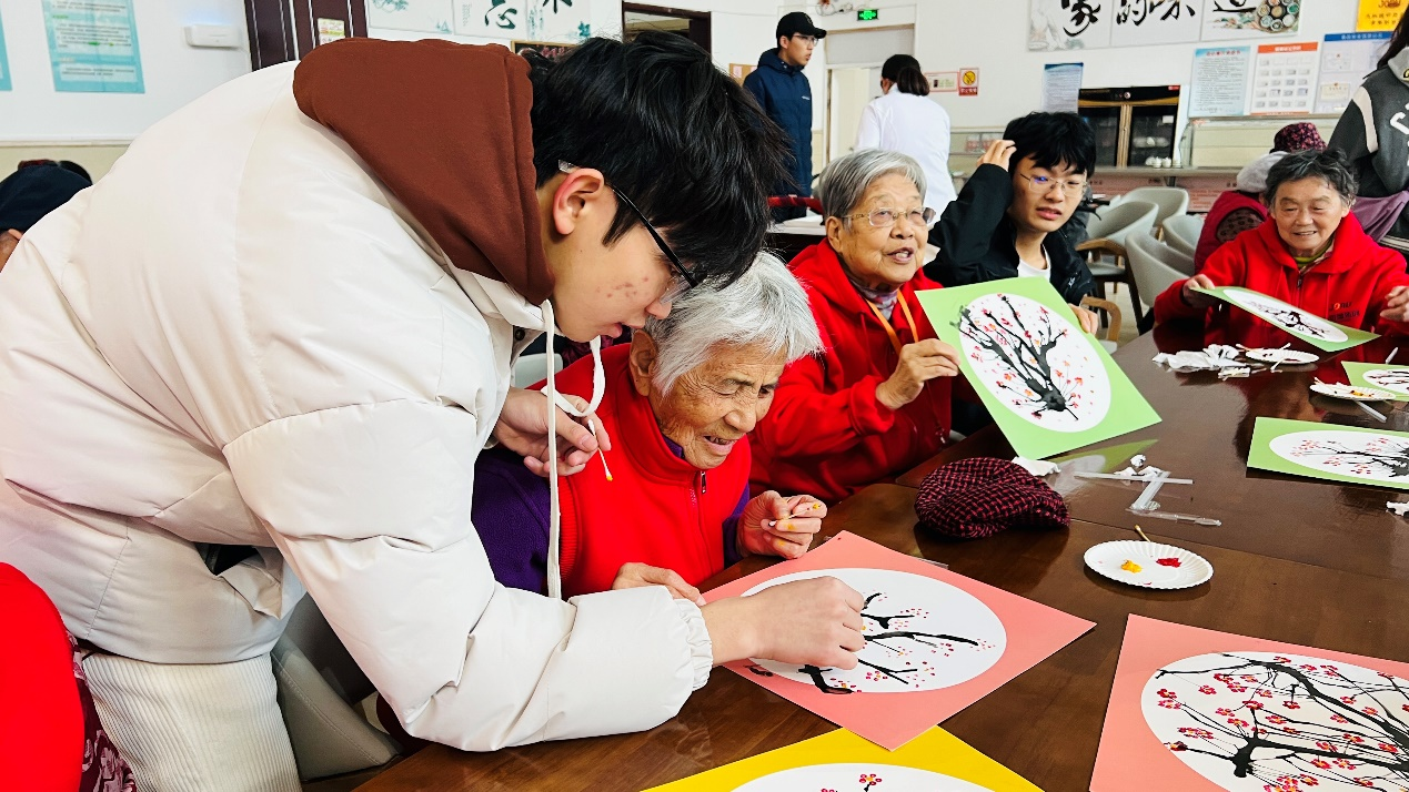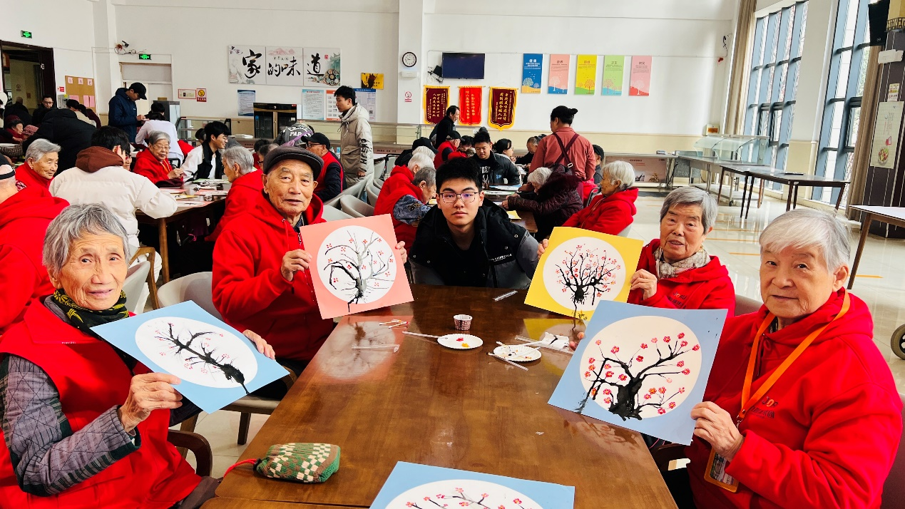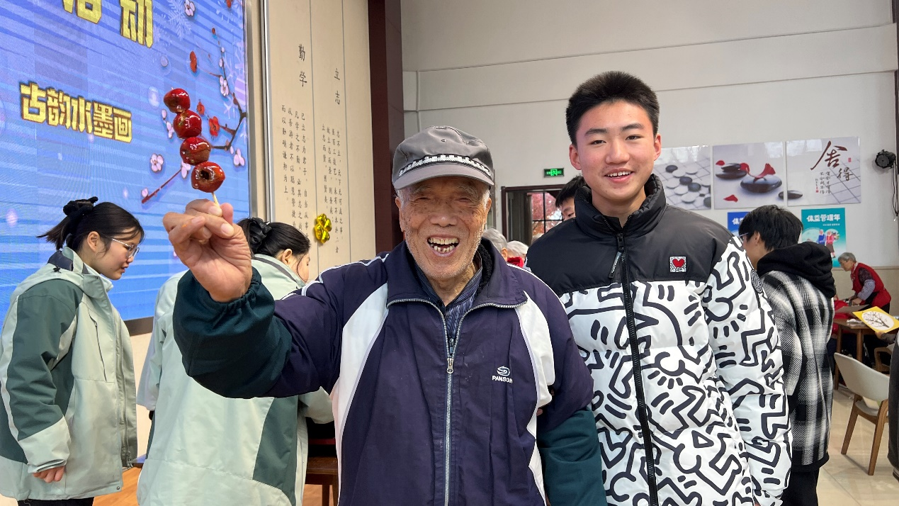 活动中,志愿者与老人们积极互动。在糖葫芦制作区,新鲜的山楂、草莓等水果在志愿者和老人们的巧手下,变成了一串串诱人的糖葫芦。志愿者们熟练地熬糖,耐心地帮助老人们将穿好水果的竹签放入熬好的糖浆中,轻轻转动,让糖浆均匀地包裹住水果。老人们脸上洋溢着孩童般的笑容。另一边水墨创作区也同样热闹非凡,志愿者们协助老人挥毫泼墨,共同创造一幅幅充满韵味的作品,老人们分享着往昔经历,讲述水墨画的技巧,年轻人认真倾听,文化在代际间传承。