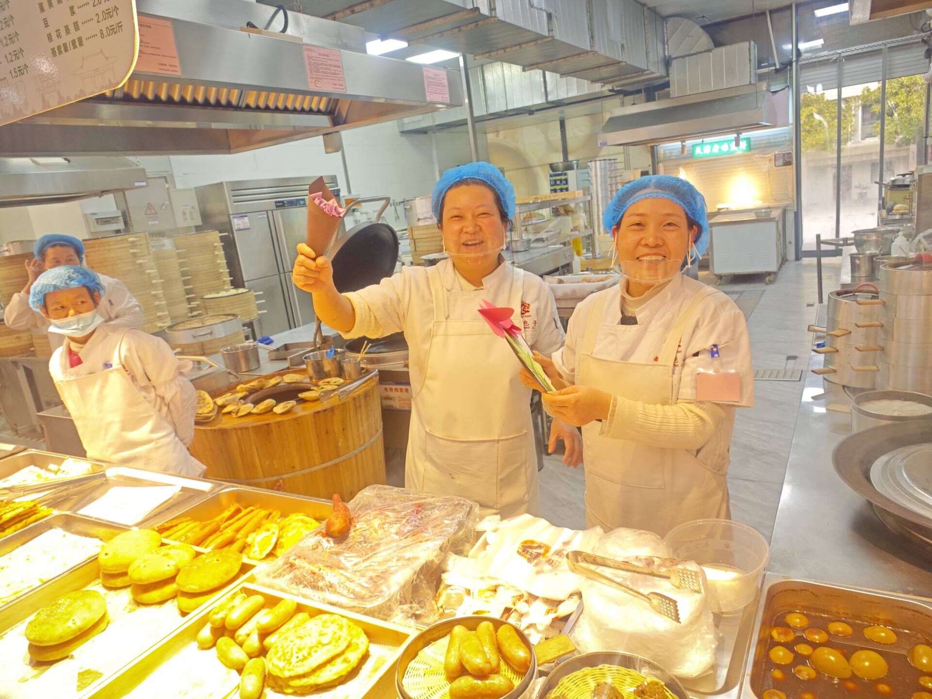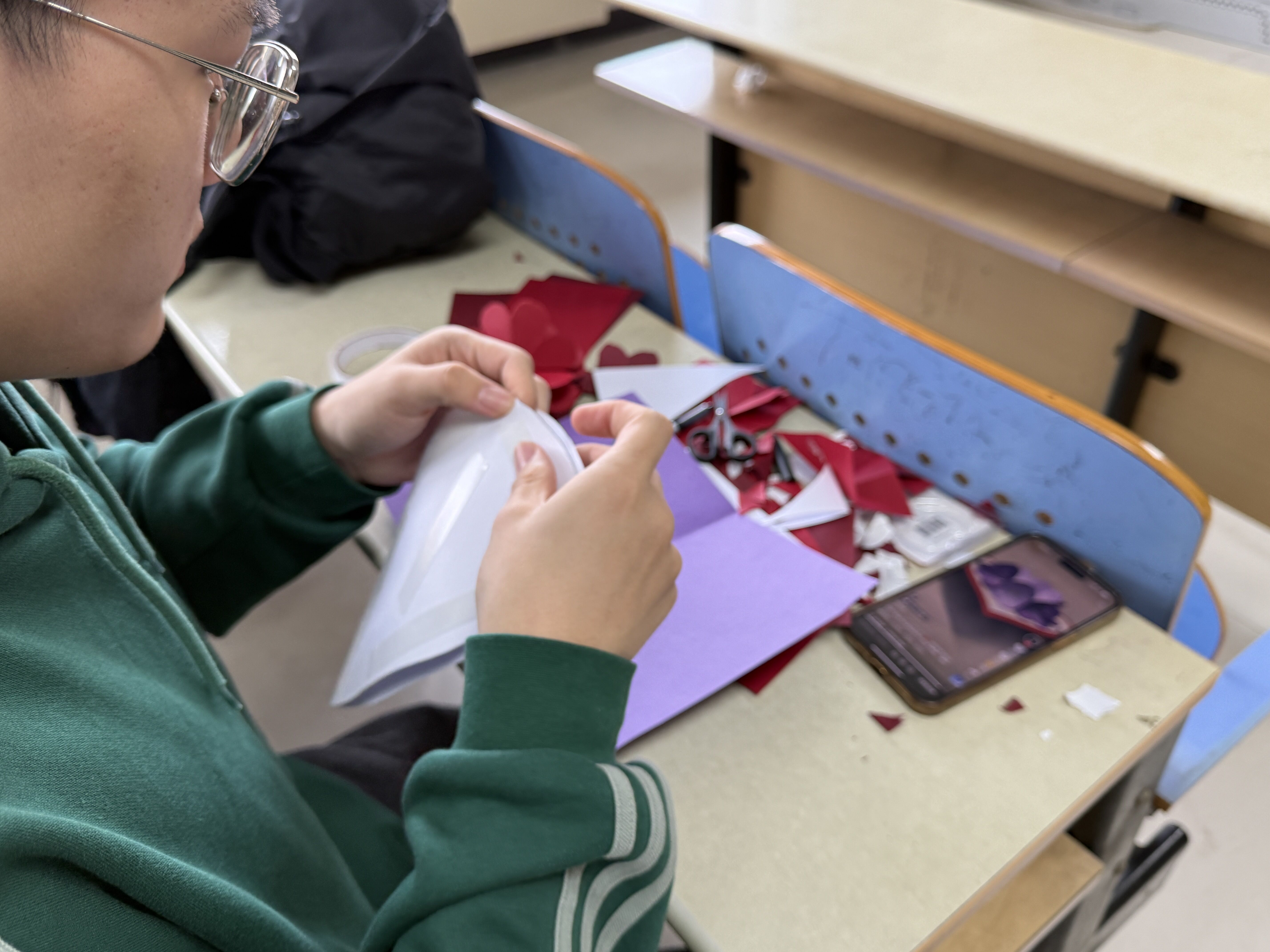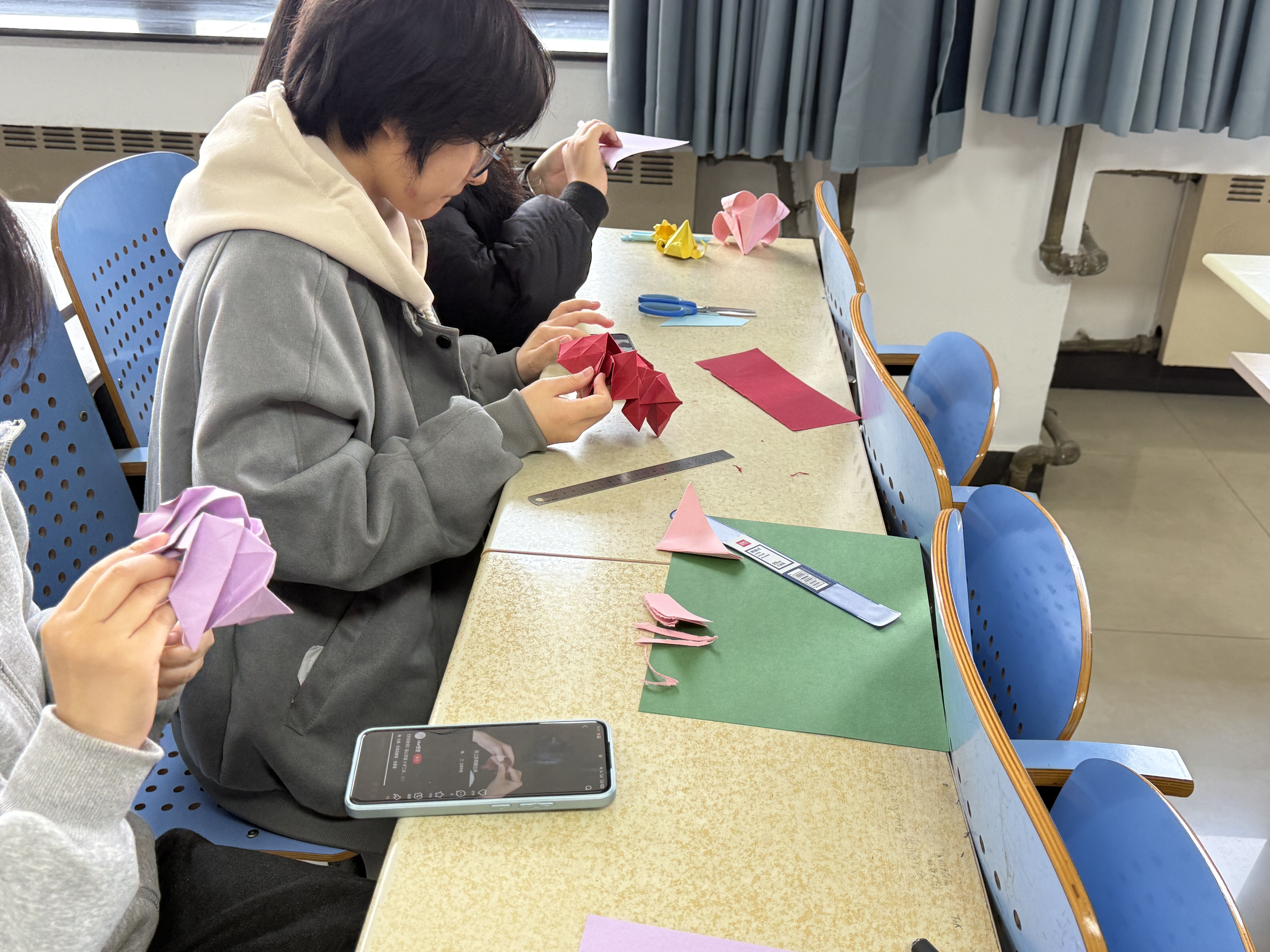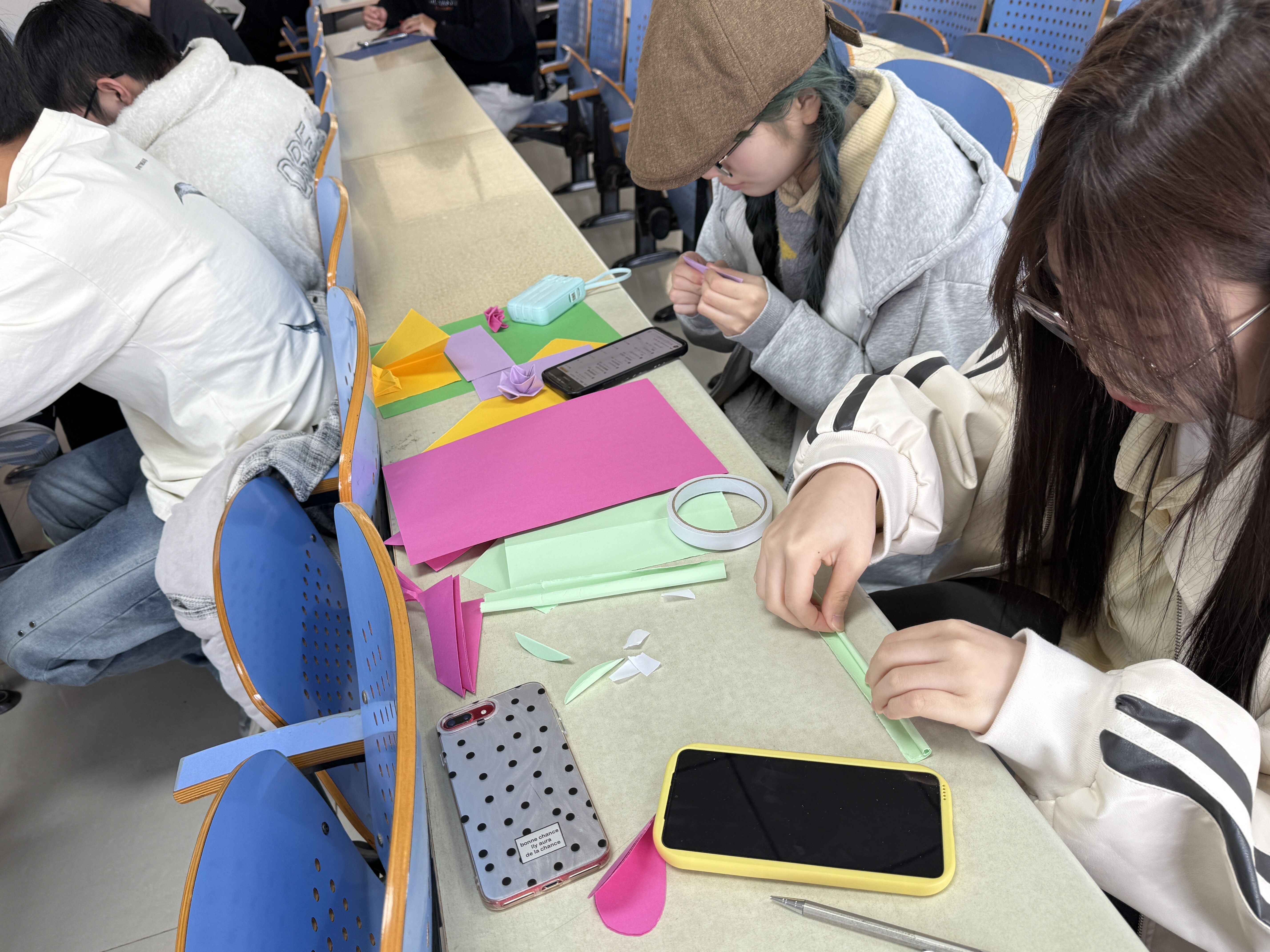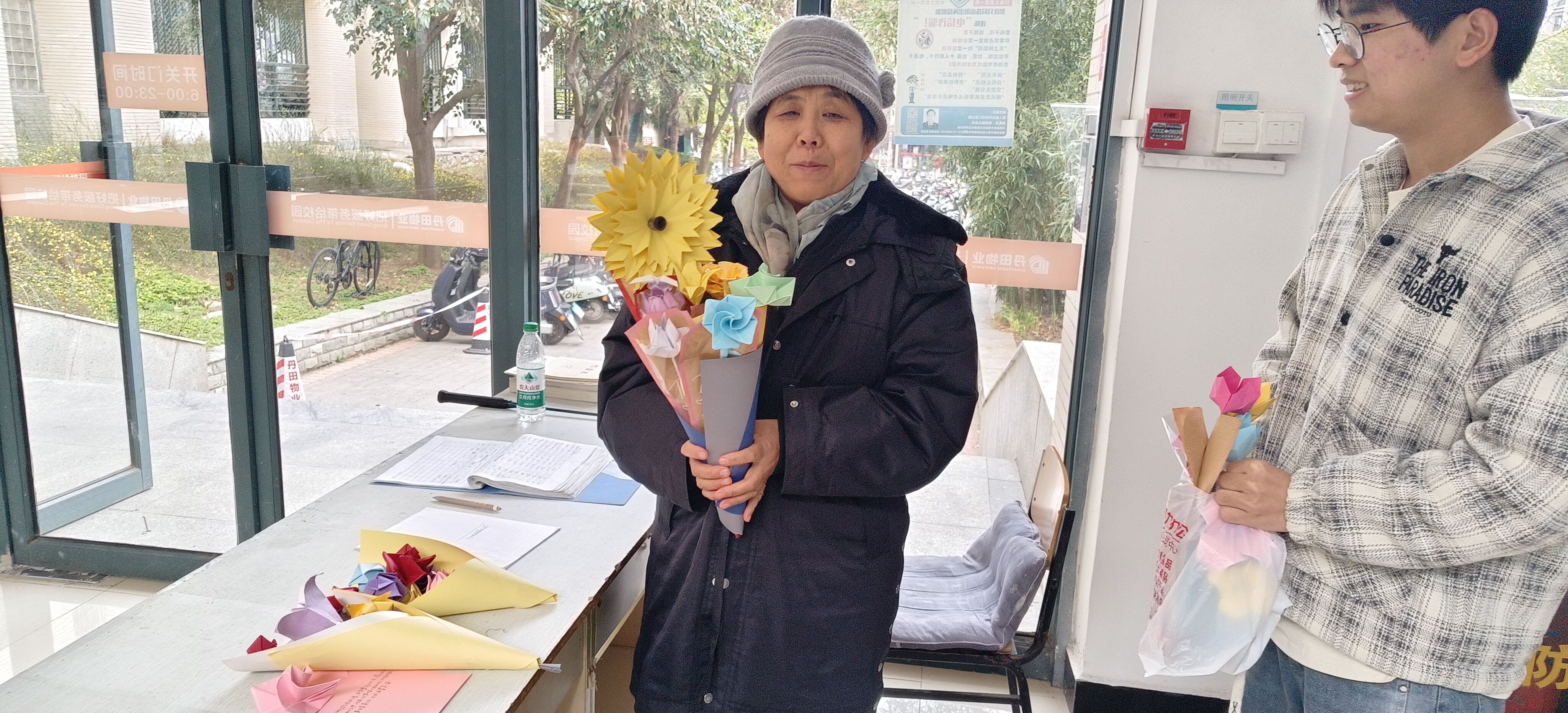活动伊始,学生志愿者现场演示折纸玫瑰、千纸鹤等传统手工艺技法,通过分步讲解与实操指导,帮助参与者掌握基础制作技巧。随后开展的自由创作环节中,同学们充分发挥创意,将彩纸、丝带等制作为手工艺品。最后由活动负责人将成品赠送给食堂阿姨,宿管阿姨并送上节日祝福,彰显了对女性贡献的感激与敬仰。