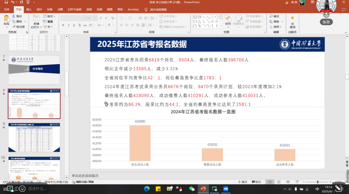 会议期间,张政详细介绍了公务员考试流程,涵盖公告发布、网上报名、笔试、资格复审、面试、体检和政审、公示等环节,提醒考生关注各阶段通知,提前做好准备,同时强调不同地区考试政策存在差异,应仔细核对。他还分享了 2025年江苏省考报名数据,指出省级机关岗位竞争激烈,最高竞争比达 1783:1。