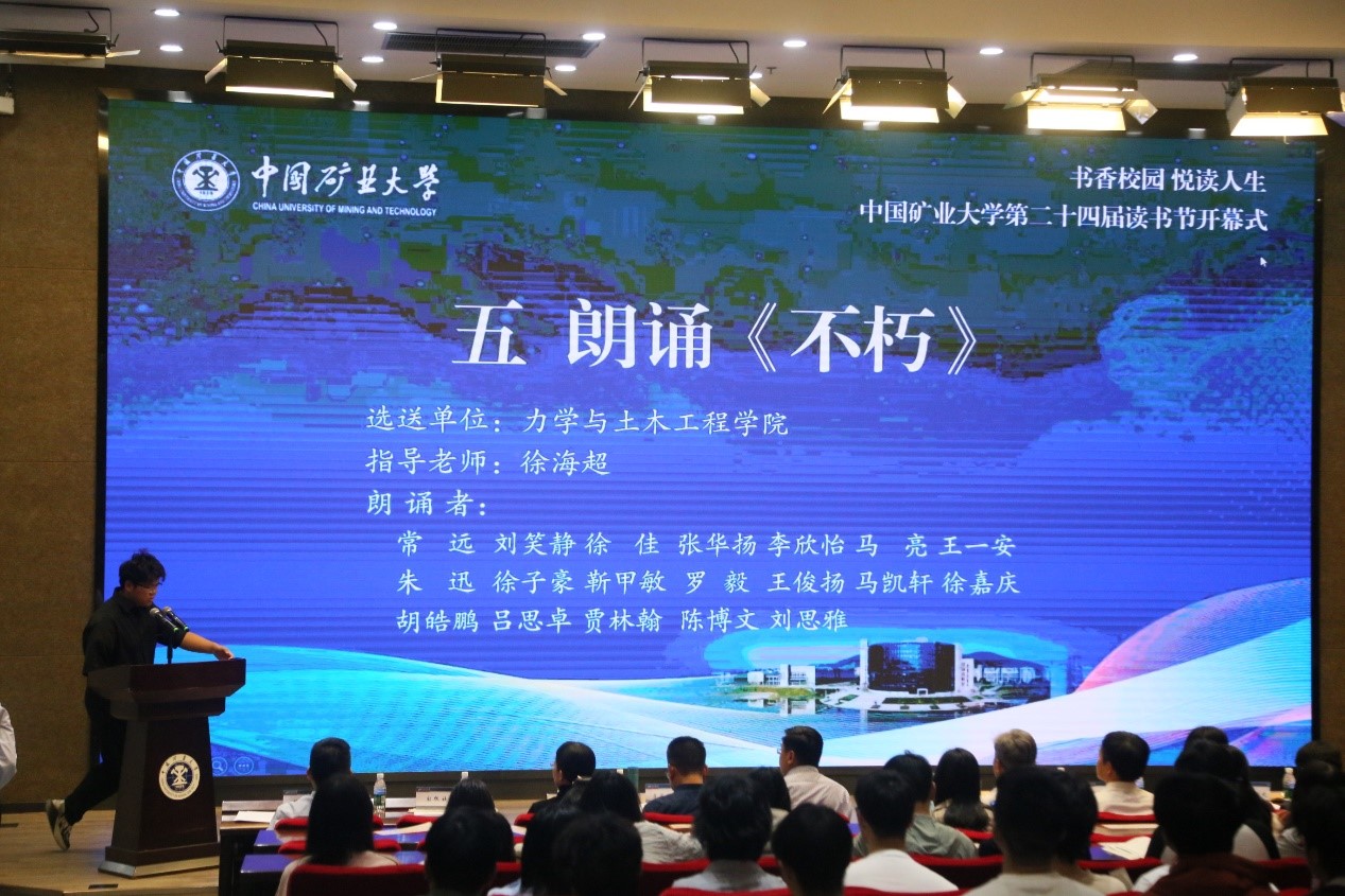 学子以饱满的热情演绎了经典诗篇《不朽》。舞台上,同学们通过声情并茂的朗诵与极具张力的舞台表现,生动再现了革命先烈为民族解放事业前赴后继、无畏牺牲的壮烈史诗。铿锵的誓言、激昂的旋律与恢弘的舞台背景交相辉映,将现场观众带入那段波澜壮阔的历史长河,赢得全场热烈掌声。此次表演延续了此前“诗颂风华,礼赞盛世”主题诵读比赛中的精神内核,以昂扬奋发的姿态,拉开了读书节系列活动的精彩开篇。
