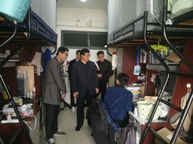 党委副书记张庆春带领各年级辅导员组成宿舍安全卫生检查组,对本科生及研究生宿舍进行检查。