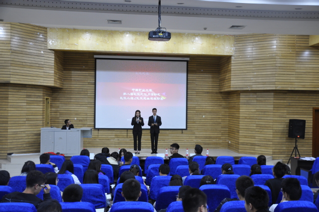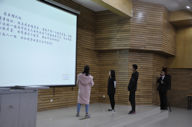 晚上七点,在经过精密的筹划之后,比赛正式开始。首先,主持人致辞并介绍了这次活动的嘉宾及评委。之后参赛同学带着自己的答题卡与号码牌依次入场。在参赛选手都大致了解了比赛规则后,比赛第一阶段开始。在这一阶段中,参赛选手们进行了激烈的抢答,展示了各自的知识储备。到了第二阶段,参赛选手们逐个演示了自己认为最能够体现礼仪文化的日常生活中的动作,这些表演也赢得了评委与同学们的掌声。最后一个阶段,由主持人进行选题,并按号码从小到大依次请同学们上台表演解决日常生活中遇到的情况。在这一过程中,同学们纷纷表现出自己的礼仪文化底蕴。最终由评委进行公正的评判和打分。在指导评委简单地点评了此次活动同学们的一些问题之后,比赛正式结束,评委和同学们有序离场。