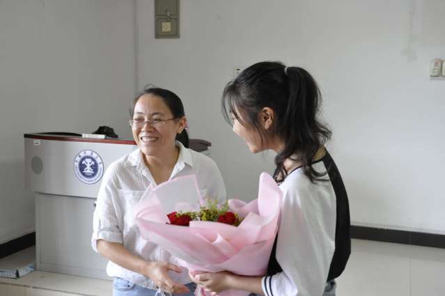 下午第七八节课,程红梅老师像往常一样,早早的来到教室准备向同学们讲授今天的课程。突然,教室中所有的学生起立向她鞠躬并齐声喊道:“祝程老师教师节快乐”。随后同学代表上前把准备好的鲜花送给老师,她这才意识到今天是她和全天下所有教师的节日,她笑着接过学生送来的鲜花,向所有同学表示感谢。“谢谢大家的祝福,我会尽我最大的努力帮助大家学好这门课,这是老师能做的,也是老师应该做的。”在课堂的最后,老师再次向同学们表达了感谢之情,同时她还不忘记叮嘱大家做好课后复习与练习,希望同学们都能够在课堂内外都能保持对学习的认真态度。