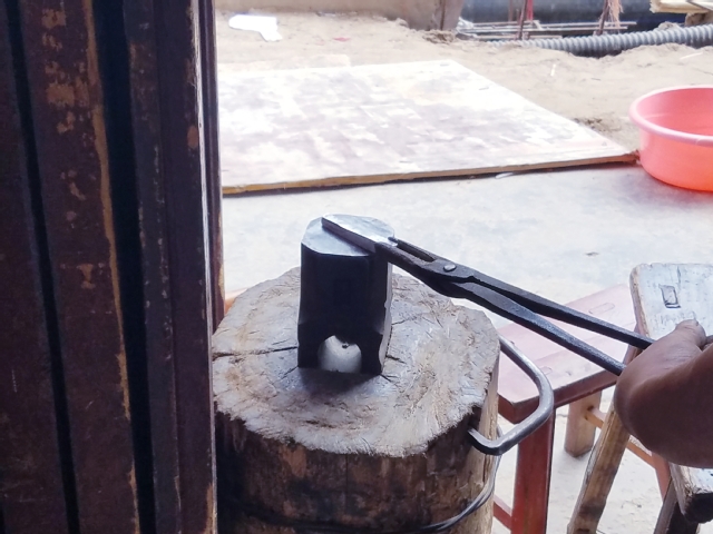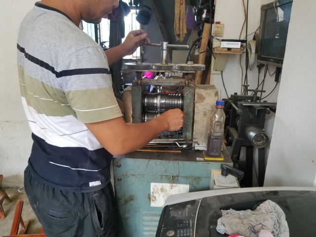 实践团到达谷陇镇后,实践活动有序展开,队员们走进谷陇镇上最有名的银饰街,到银饰制作工坊进行考察,工坊中热情的苗族银匠为实践团详细讲解了银饰制作的过程。队员们了解到当地苗族银饰的制作过程主要分为熔炼、捶打、拉丝、掐丝、镶嵌加固和洗涤六个步骤,但由于时间原因,实践团成员们只看到了熔炼、捶打和拉丝三个步骤。