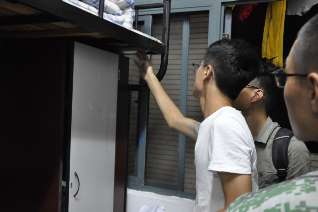 学生干部们进入宿舍后,先是与新生们亲切交谈,询问他们进入大学后的军训生活情况,并对学弟学妹们提出的问题一一解答。接着,作为“过来人”,学长学姐们开始指导新生进行军训内务整理。 “这个地方还有些灰尘,学弟麻烦给我一块抹布”,同学们认真检查宿舍中的每一处地方,对一些很难被发现以及打扫的卫生死角,也主动帮助新生进行打扫。针对部分宿舍的在寝人员较少,内务整理工作还未完成的情况,学长学姐们就组织临近新生宿舍成员帮助开展内务整理工作。当新生遇到难处理的内务问题时,学长学姐也都耐心解答并不时鼓励新生,希望他们能在军训内务整理的过程中得到锻炼,在军训内务工作中展现土木学子一丝不苟的态度。