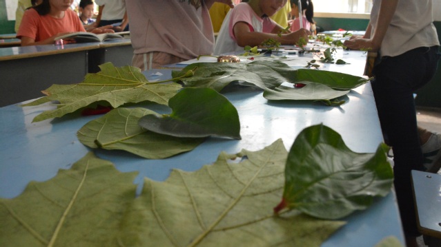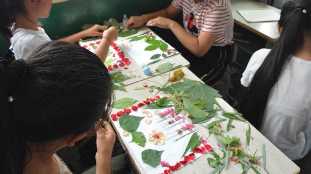 8月8日上午10点左右,“树叶粘贴画”活动正式开始。在此前的8月7日,支教队员们嘱托孩子们自己准备必需物品,如A4纸、树叶、花瓣、胶水、剪刀等。本次活动按照班级为单位举行,各班级教室由担任班主任的支教队员负责,在活动中,各位支教队员主要负责引发孩子们的想象力,以树叶的形状为基础,拼接图形,进行线描装饰。有很多孩子们的创造力和动手能力很强,他们不仅仅创造出精美的树叶粘贴画,还创造性地制作出了花篮等手工艺品。值得一提的是,孩子们在下课后大都自愿将自己的“小作品”送给了自己喜爱的支教队员。