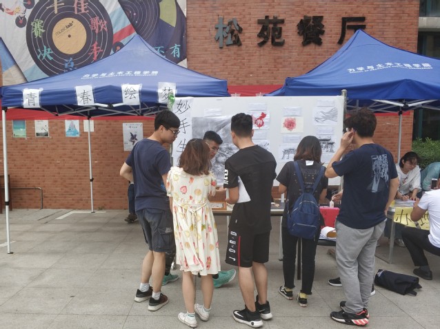 社团联合会活动事务部于二食堂广场举办“青春绘梦 妙手生花”绘画设计制作大赛,在比赛现场展览了优秀作品并进行现场投票评选。