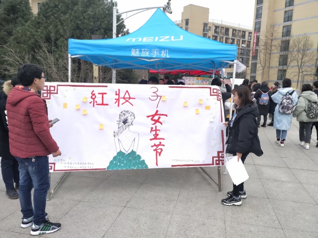 女生的美好祝福。第二阶段,于二食堂广场进行“红妆女生节”的宣传工作,让同学们具体了解本次活动的活动流程及内容,并鼓励同学们积极参与。同时构建以“执笔为她,赠下流金年华”为主题的祝福墙,让同学将祝福语和所祝福的人的姓名写在便利贴上,并粘贴在祝福墙上,表达对未来的美好期待,拿到编号为3或7的倍数便利贴的幸运同学还会获得精美的小礼物。第三阶段,进行拯救女神活动的宣传介绍和报名工作。本次活动受到了同学们的积极参与和响应,取得了令人满意的成果。