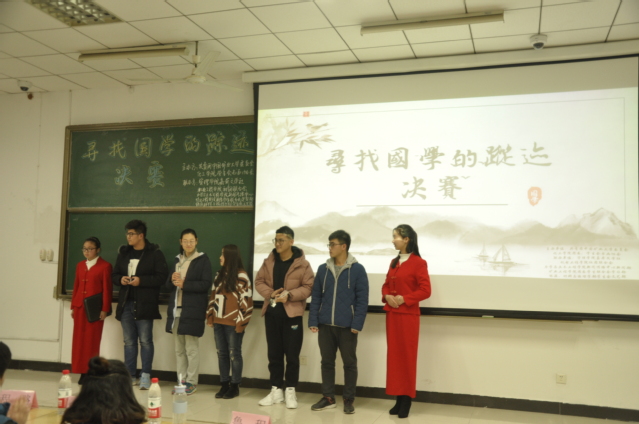 国学的历史就是中华文明的历史,静静地流淌在所有中华儿女的血液中。然而现如今,随着科技时代的进步,各种外来文化开始对国学文化产生了巨大的冲击,中华传统文化面临巨大的考验。针对这种现象,此次决赛要求参赛队伍围绕“如何拯救国学?国学为何沦落至此?何以成为国学大师?”三个主题中的任一主题展开3-4分钟的演讲,此外,参赛选手还需要进行个人国学方面能力展示,选手们可以从“ppt演示,现场展示,现场答辩”三方面入手进行展示。下午3点,在主持人对比赛的规则做出简单的介绍之后,比赛正式开始了。上周,经过初赛中精彩的知识竞答,一共有十二支队伍进入本轮决赛。比赛中,选手们有的结合ppt对自己的观点作出了精彩的演讲,有点则通过播放短视频的方式来吸引评委的眼球,还有一些选手展示了一些能够体现国学素养的作品,比如一些镌刻、国画、书法等优美作品。最后,评委们对各组选手的展示作出了悉心的指导和精彩的点评。下午5:30,此次国学知识竞赛决赛顺利结束。