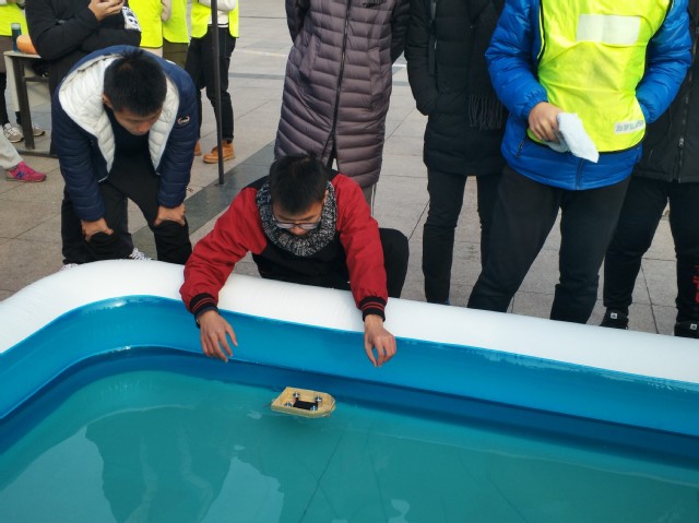 上午八点半,签船比赛正式开始。参赛选手依照规定的时间前往船只存放地点领取自己的比赛船只,并赶往青春广场的入口处签到。现场工作人员报号后,引导参赛选手进入参赛区准备比赛。进入比赛区域后,参赛选手先到现场的一号水池对船只进行速度测试,若测速成功后则在工作人员指引下到二号、三号水池进行载重测试,若完成全部的三级加载即为比赛成功。比赛现场,还设有签名、摄影墙,参赛选手在比赛后可以到签名墙处签名并拍照留念。比赛过程中,不少参赛队伍遗憾止步第一轮,但也很多比赛队伍都成功完成了全部的三轮加载。签船比赛趣味盎然,氛围热火朝天,现场洋溢着参赛选手们对比赛的期待与成功后的激动之情。