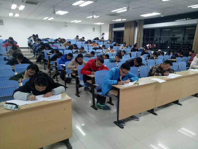 晚6时50分,八个考场的监考人同时宣读考场规则和考试流程,并发放考卷。7时整,进入第一个环节作文考试阶段。紧接着开始听力考试,播放听力时间为25分钟,大一新生仔细聆听、认真答题。半小时后听力考试环节结束,监考人开始收答题卡一。9时20分,考生停笔,离开考场,监考人准时收试卷和答题卡二,并上交负责人。后期所有试卷和答题卡交由15级学生志愿者统一批改、核算考试分数。