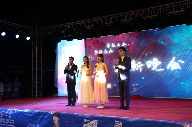 全体师生对于2017级新生到来的欢迎和祝福。此次晚会在中场期间还设置了游戏环节,吸引在场观众共同参与互动。最后,由2017级新生辅导员李亮和兼职辅导员吴双共同演唱了歌曲《独家记忆》和《奔跑》,歌声中承载了他们对于新生的美好的祝福以及积极的期望。晚上十点,本次迎新晚会顺利结束。