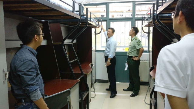 党委副书记张庆春、院团委书记倪涛涛、2015级辅导员游洋、2016级辅导员曹鹏和2017级辅导员李亮,前往学生宿舍,检查学生军训时期内务整理情况。