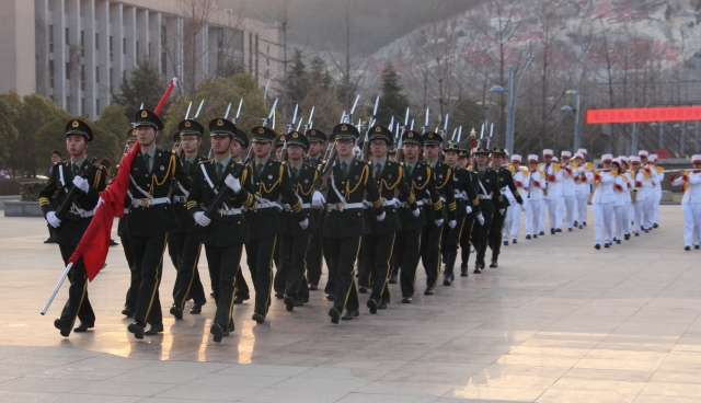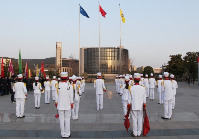 启动仪式的第一项是升国旗校旗仪式。七时许,在大学生管乐团吹奏的激情豪迈的旋律声中,国旗护卫队昂首挺胸,飒爽英姿,护卫着国旗迈着矫健的步伐进入升旗区。在激昂嘹亮的国歌声中,全体师生满怀深情,注视着五星红旗徐徐升起。国歌毕,伴着管乐团奏庄严浑厚的《黄色直播