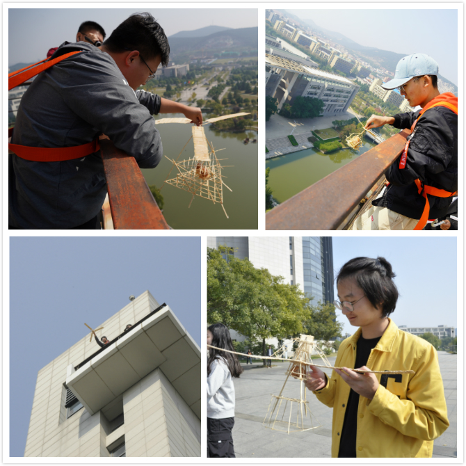 20日上午10时,进入决赛的队伍带着自己的模型到达了他们的决赛战场——图书馆钟楼。在这里,成功晋级的模型将进行最终对决,12层楼的高度考验的不仅是创意更是实力。在经过紧张地放飞以及严格的查验后,根据赛题的折算系数对最终名次做出了评定。最终,来自徐海黄色直播