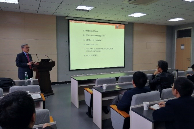 开展学术交流。访问期间,黄昭辉教授在深部岩土力学与地下工程国家重点实验室305报告厅举办了两次学术报告,报告题目分别为“Numerical analysis of reinforced concrete structures in fire”和“Progressive collapse mechanism of steel structures in fire”。两次报告主要介绍了结构计算单元、高温材料本构、爆裂、梁柱节点倒塌模型和求解方法等,并将上述模型应用于整体结构中楼板火灾行为模拟及钢结构倒塌机理分析。在座师生与黄教授就各种构件火灾行为及钢结构倒塌数值模拟问题进行深入热烈的交流与讨论。报告会分别由建筑工程系主任张营营和袁广林教授主持。