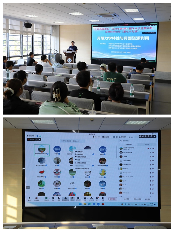 土木名家讲坛(2024年第4期)暨学术沙龙(第59期)、深地科学论坛(第79讲)在深地国重305会议室举行,本次讲座的主题是“月壤力学特性与月面资源利用”,邀请东南大学赵学亮、武汉大学聂家岩、深圳大学刘一飞、成都理工大学李谦以及本校土力所朱启银、李瑞林两位副研究员,共6位青年学者参会作学术报告,线上线下师生参会共计100余人。