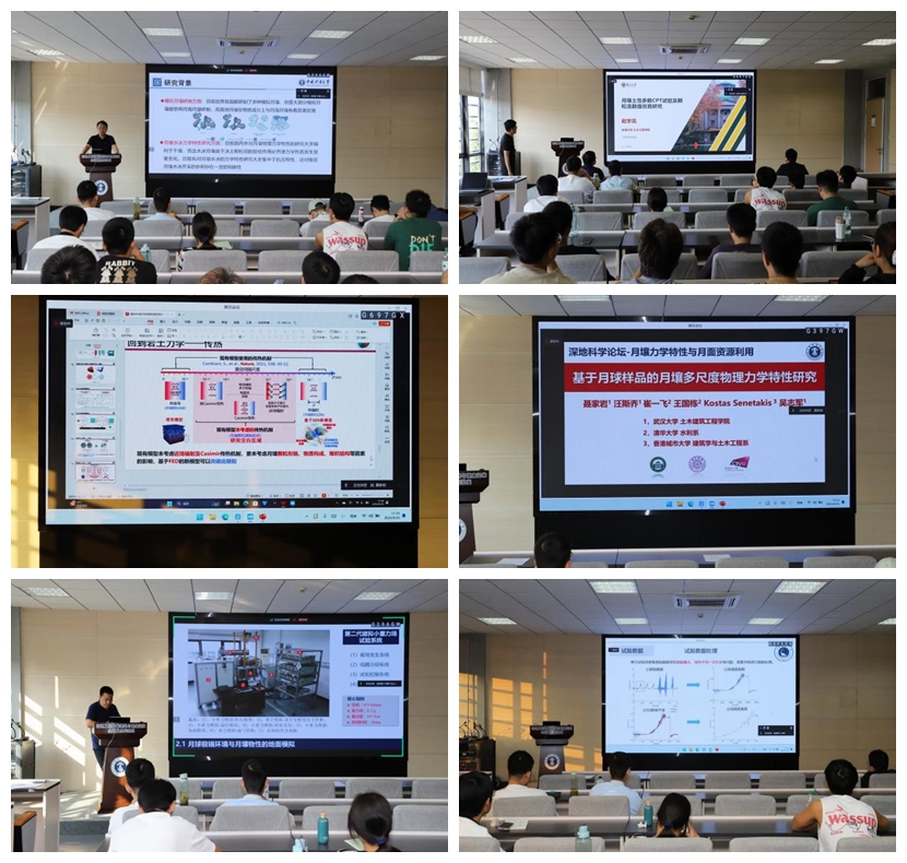 在学术报告环节,六位青年学者各展所长,围绕月壤的力学特性、模拟月壤的研制、真空环境对月壤传力传热特性的影响、月壤多尺度物理力学特性的研究、月下基地与资源智能化协同建采的体系与进展,以及钻进采样对月壤扰动的量化研究等主题,进行了深入而细致的阐述。他们的报告内容丰富、数据详实、分析透彻,不仅展示了各自团队在月壤研究领域的最新成果,也引发了现场师生的广泛讨论和深入思考。